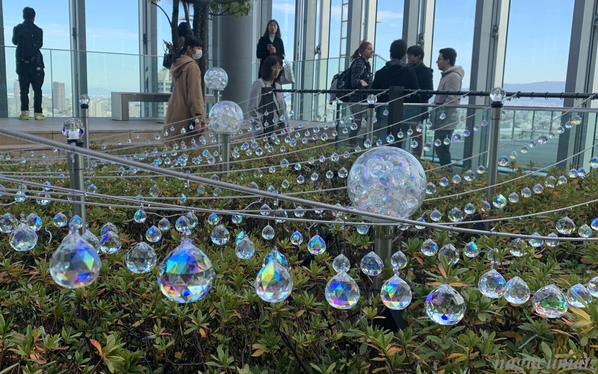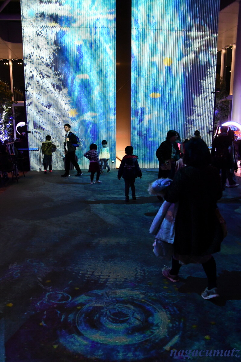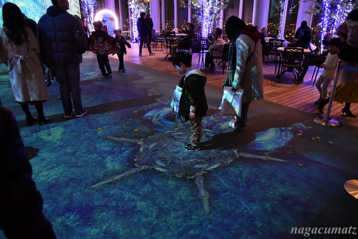 「CITY LIGHT FANTASIA by NAKED –Crystal World–」なる催しを行っていて、58階天空庭園の通称「ツインタワー」と床面を一体的に用いて、3Dプロジェクションマッピングをしていた。映像が床を歩く人の動きに連動するので、子供達は大喜び。
