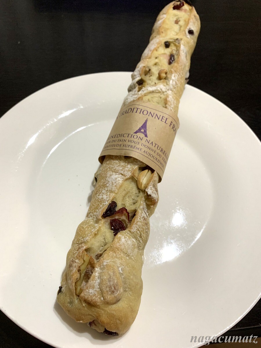 やさしいバゲットフリュイ 630円 アーモンド、クランベリー、レーズン、グリーンレーズン、カシューナッツ、クルミが入っている。