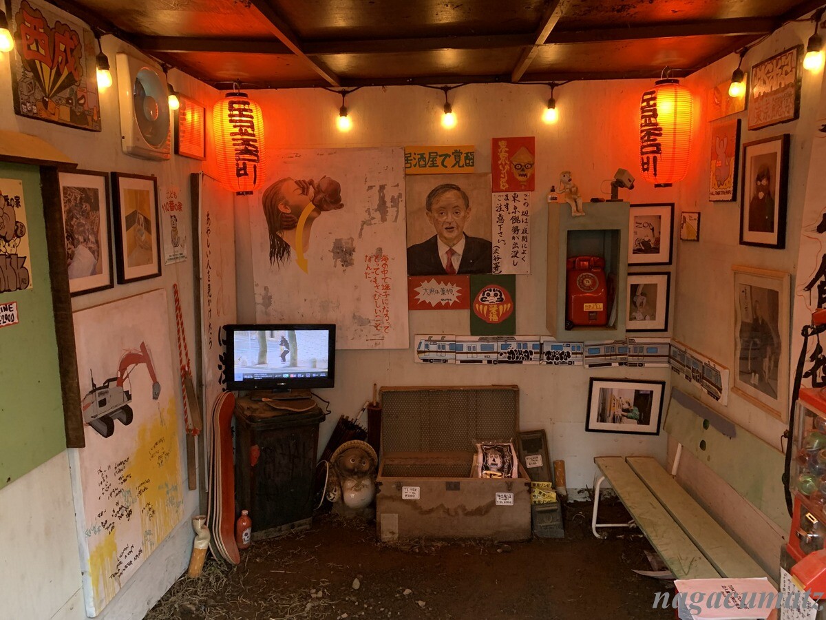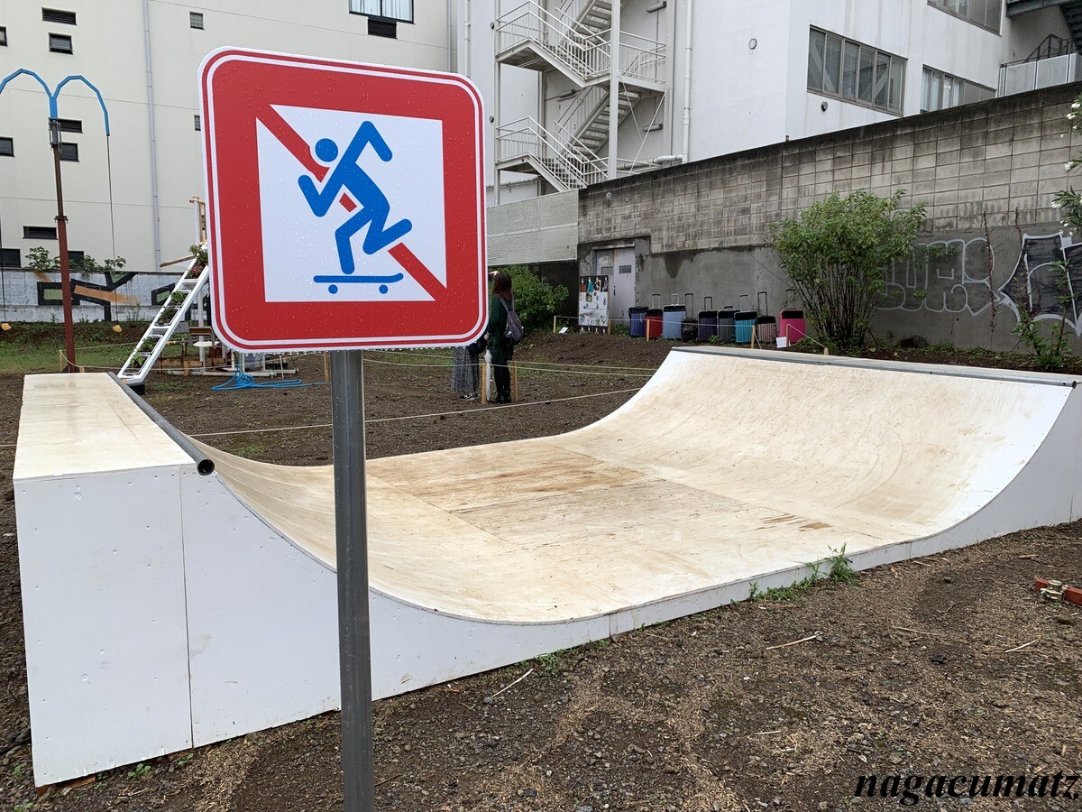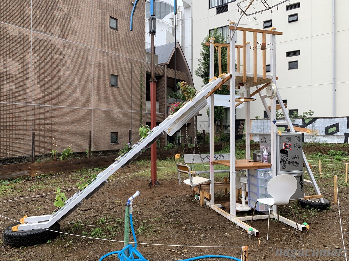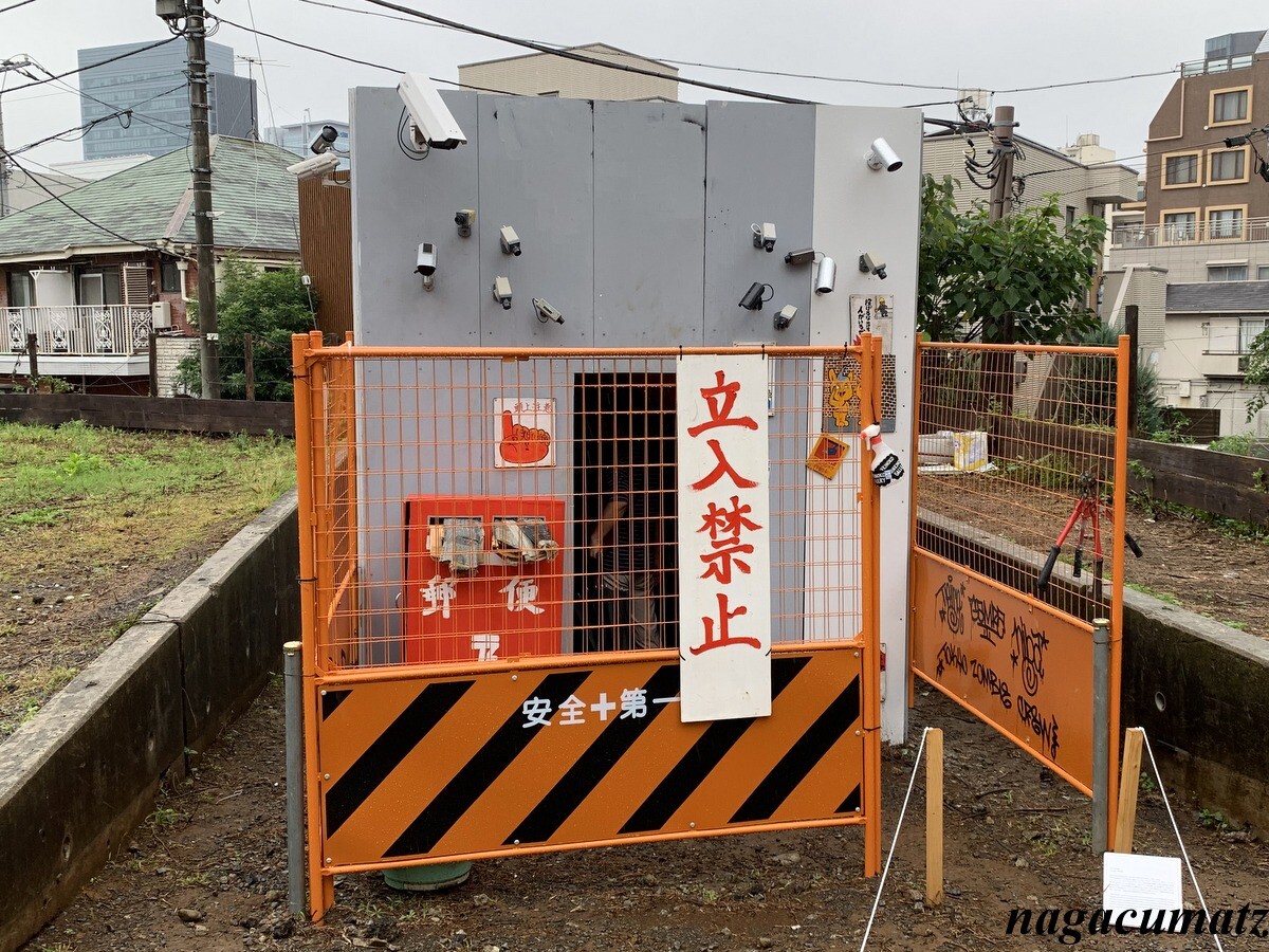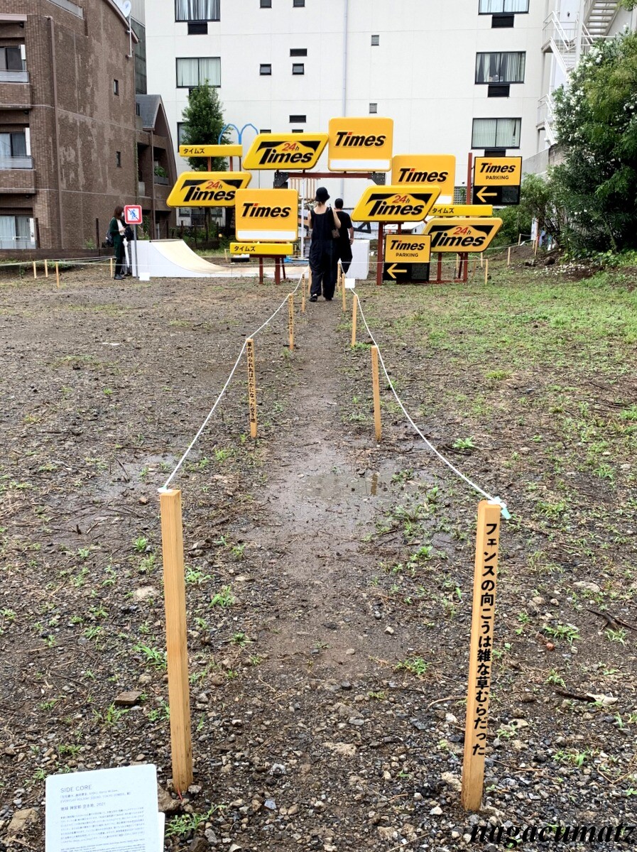 7組のアーティストによる。この空き地は、もともとオリンピックに向けて取り壊されて出来た空き地だったが、次の目的が決まらないままとなり、財務省が所有している。その一部を借りて設営したとのことで、この細長いアプローチの外側は国有地なので入らないで、と。