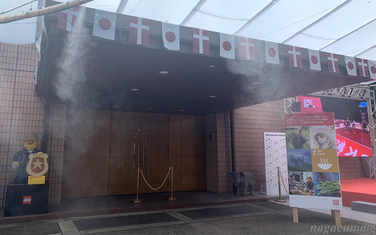 大使館の前庭に、各企業のブースや、ホットドッグや飲み物を売るスタンド、パラリンピックを一緒に見る大きなビジョンなどが置いてあり、子供が遊べるようにレゴブロックなどが置かれていた。
