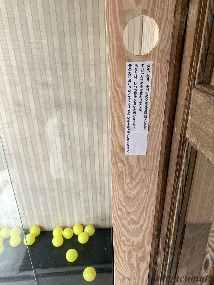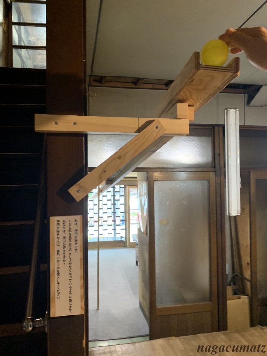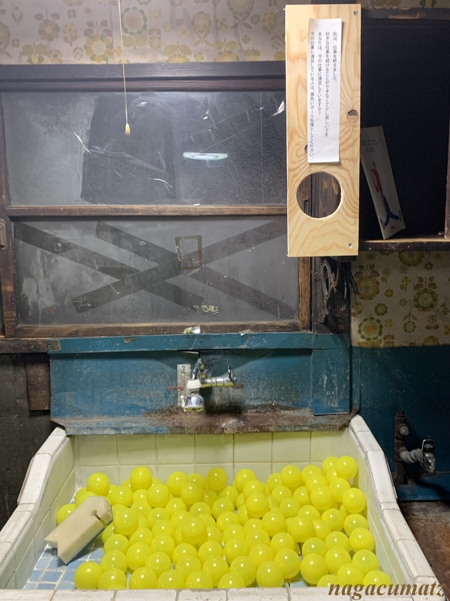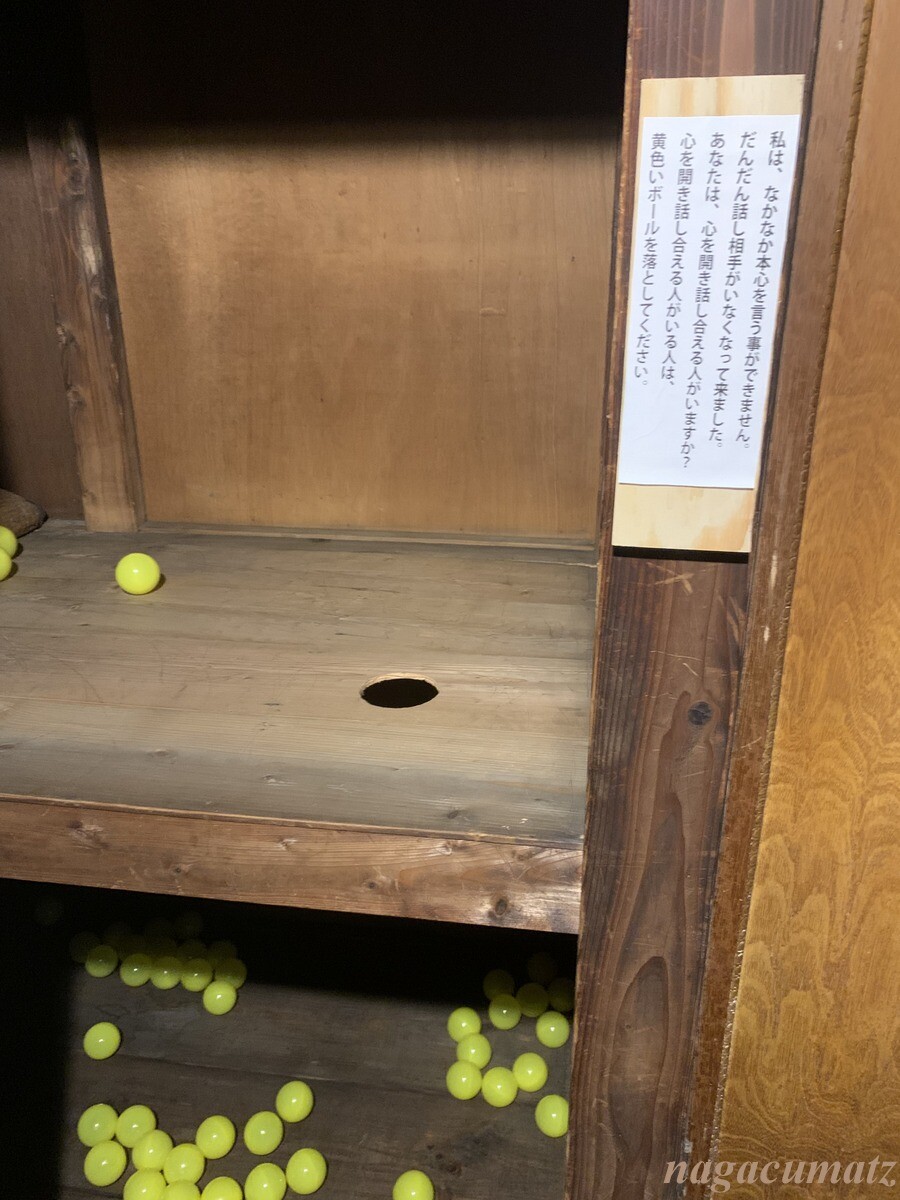ところどころに、文章が書かれていてそう思うとそこにある穴から渡された黄色いボールを入れるしくみ。