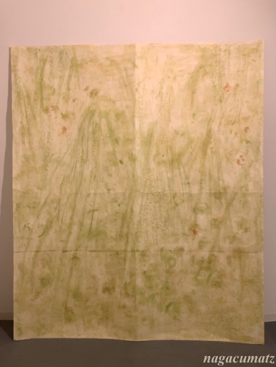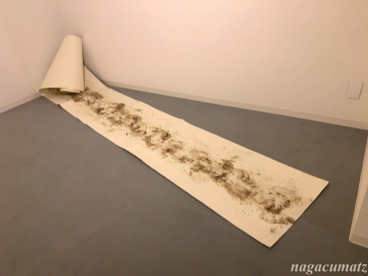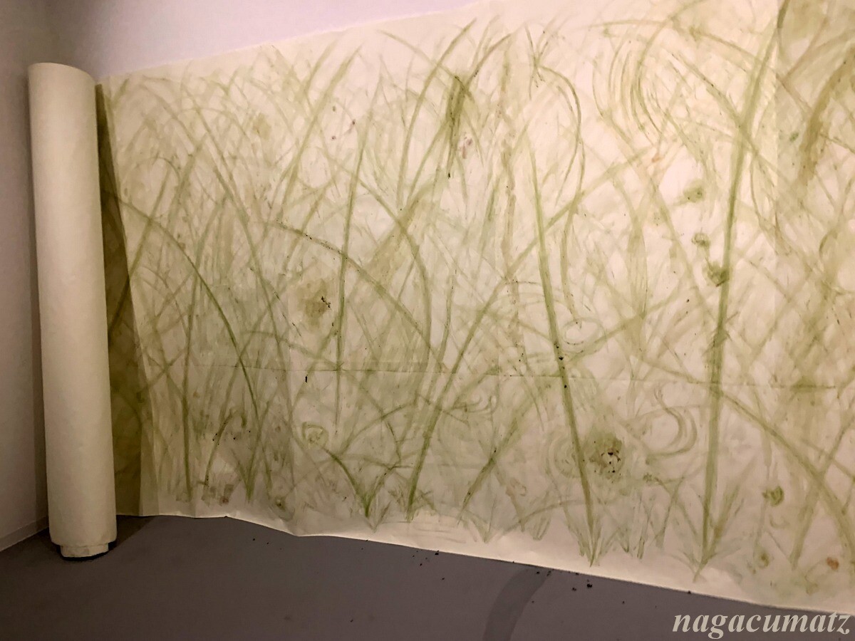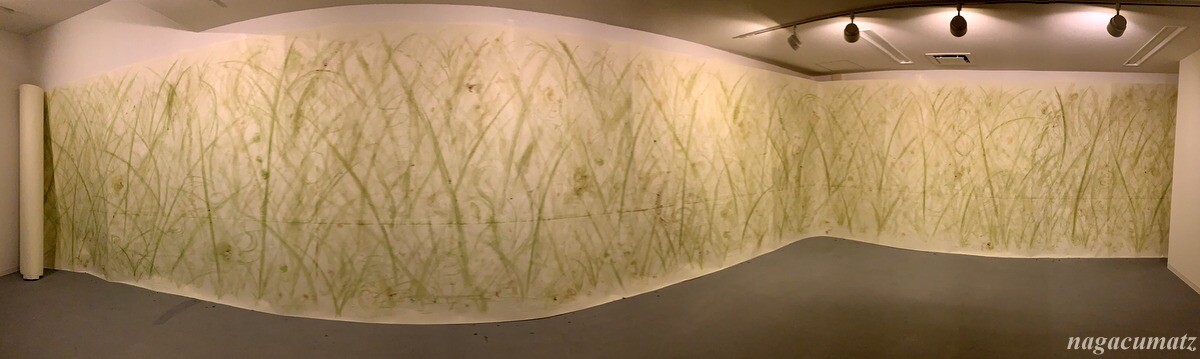 生の植物であr花・草・根・枝などを手で紙や壁などに擦り付けて絵を描く村上氏考案の「緑画(りょくが)」と言う手法を用いている。絵の色彩は紅葉するように変化していくのだそう。大きな巻紙に土や草を使って描かれているので、その匂いがする。視覚からだけでなく嗅覚からも体感する為に空調を24時間かけてドアなどは開けずにキープしておられる。