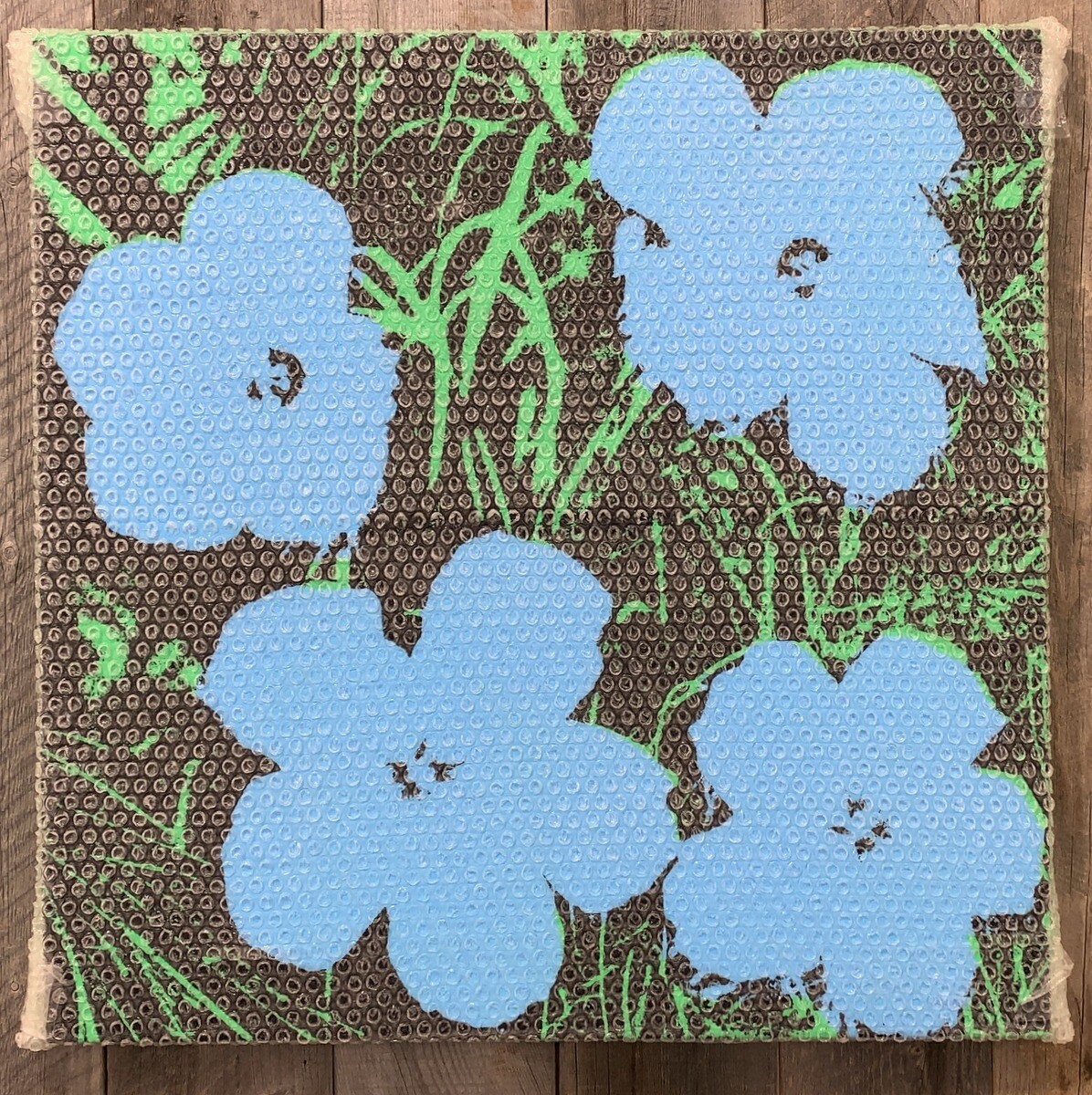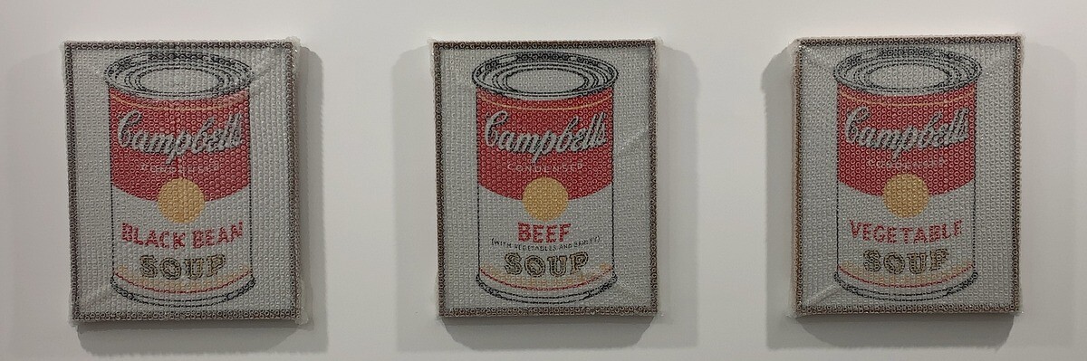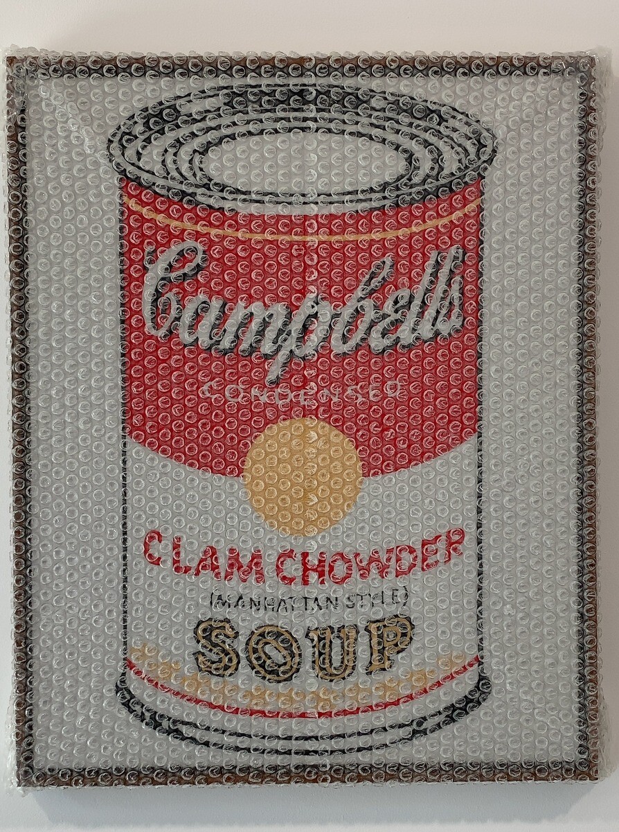 アンディ・ウォーホルの代表作を再現した作品などに、実際はアクリルポリマーを鋳込んで作ったハイパーリアルな気泡緩衝材や段ボールなどの偽の梱包材で、その作品を包んだり覆ったりするといった独自の作品となっている。