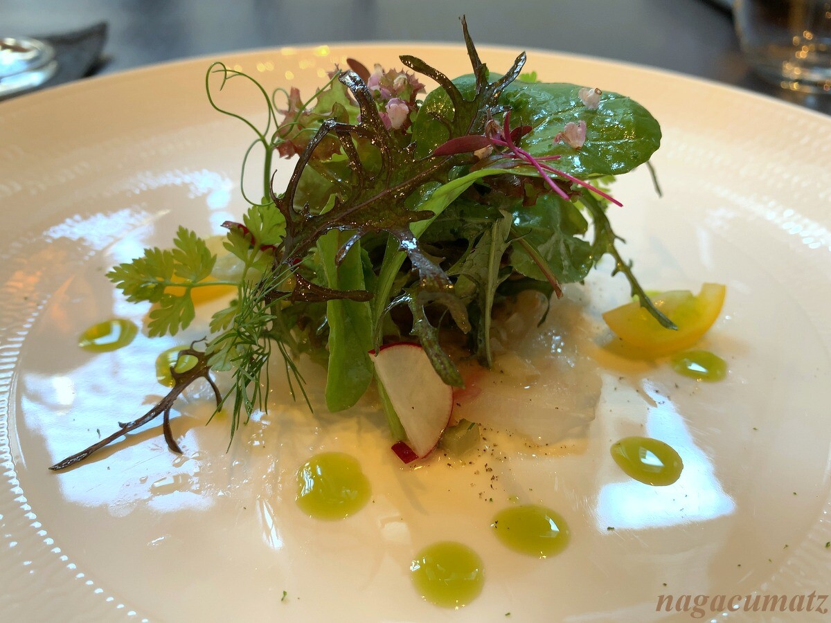 真鯛のカルパッチョ。バジルソースに、カボスなどがかかっている。肉厚な真鯛。