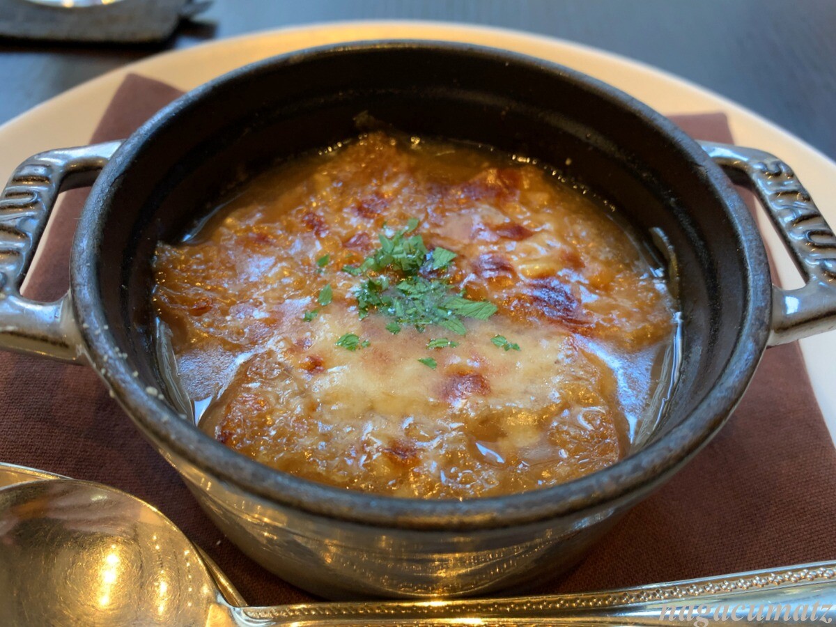 オニオングラタンスープを。底にたっぷりのグリュイエールチーズ。