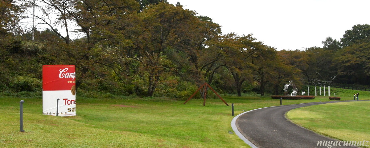 全長約7メートル、スケール30万分の1の日本列島の形をしたベンチ。渋川市は、最北端の宗谷岬と最南端の佐多岬を円で結んだ四島の「ヘソ」であることから、美術館の中心に設置された。ベンチに付けられた高低差は地球の丸さを表現し、ベンチの方位は実際の日本列島と同じ向きに設定されている。床面には、美術館オープン時に植樹され、環境整備の為に切られたモミの木の年輪が、生息していた方位のままに描かれている。アンディ・ウォーホル Andy Warhol「キャンベルズ トマトスープ」1928-1987