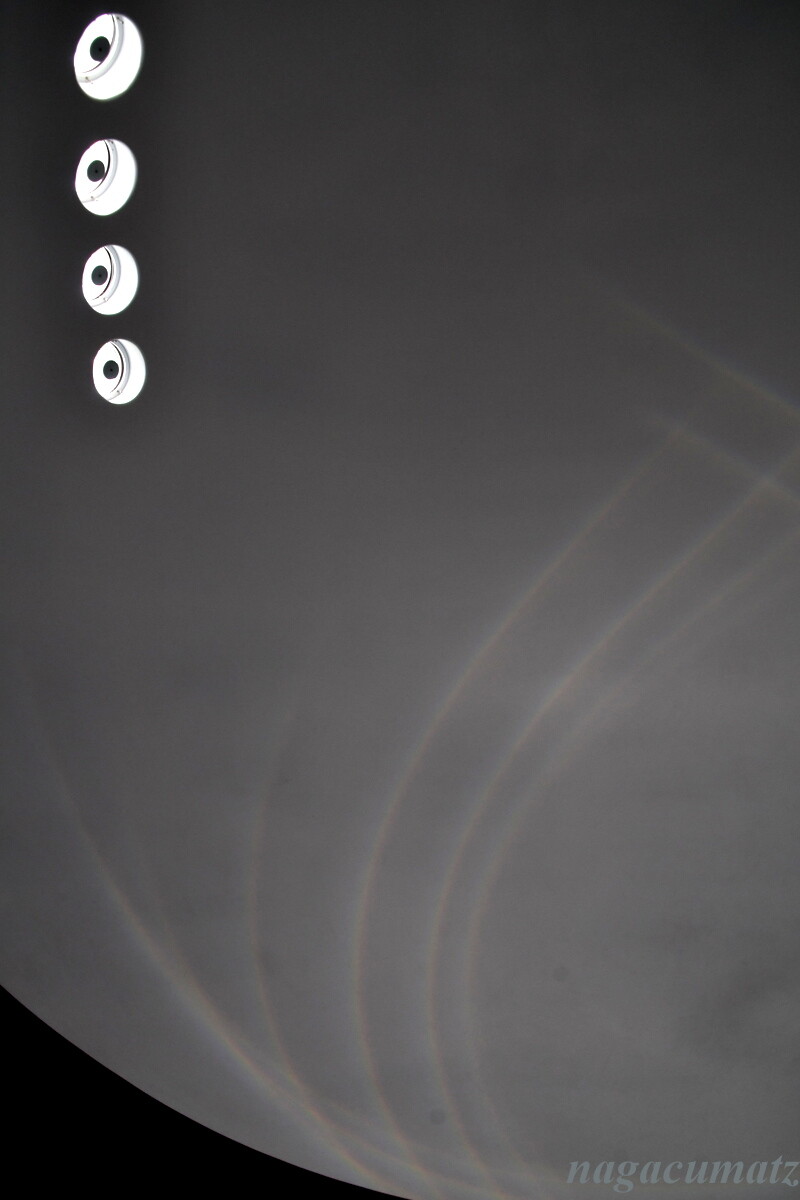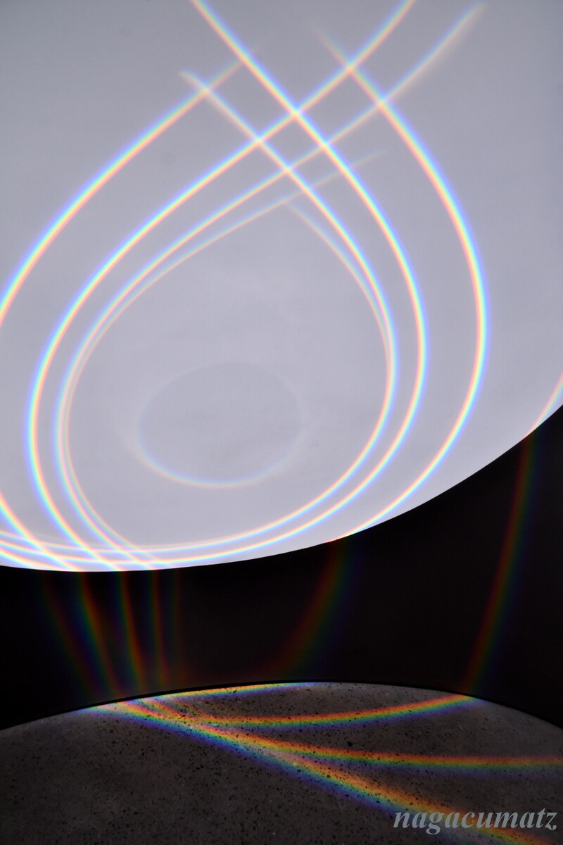 光を自在に操り楽しめる作品が多いオラファー・エリアソン氏。天空を横断する太陽の軌跡を年間を通して視覚的にとらえる観測所で、方位を綿密に計算して設置されている。ドーム型の装置の内部には、プリズムレンズを通過した太陽光が美しい虹となって映し出されるが、約2週間(節気)ごとに完全な円形を作る。冬は早朝に夏至の頃は日中の遅い時間に円形の虹が現れるのだそう。完成には構想から4年の歳月がかかったもので、日本の美術館での初めての常設展示作品。