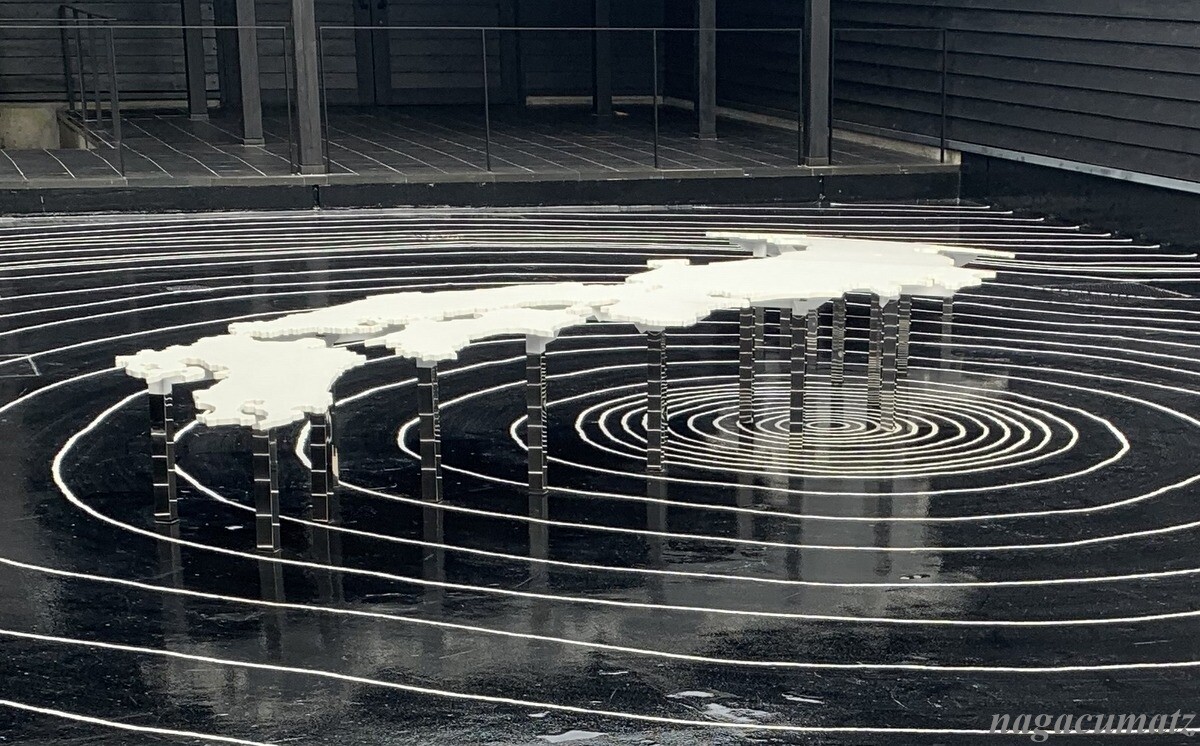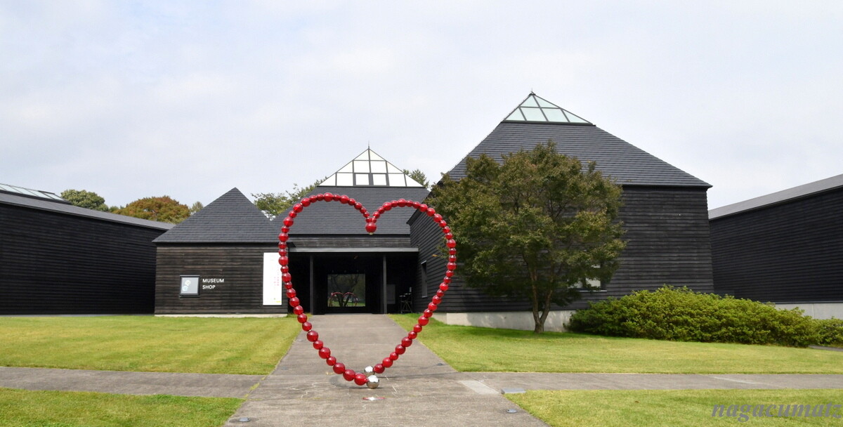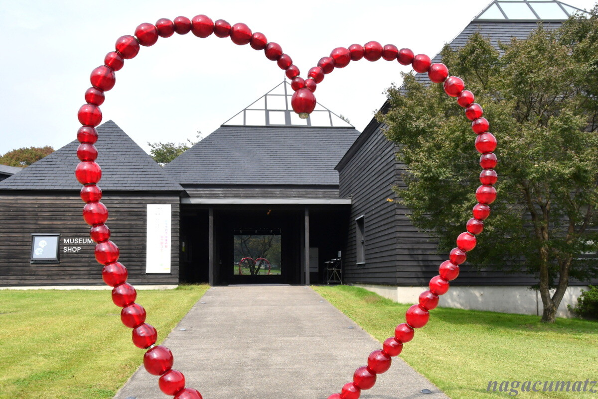 正面玄関にあるのだが、作品を越えて入り口に進んで行くと、映り込んだ♡の中に自分がいるように見えると言うにくい演出も。