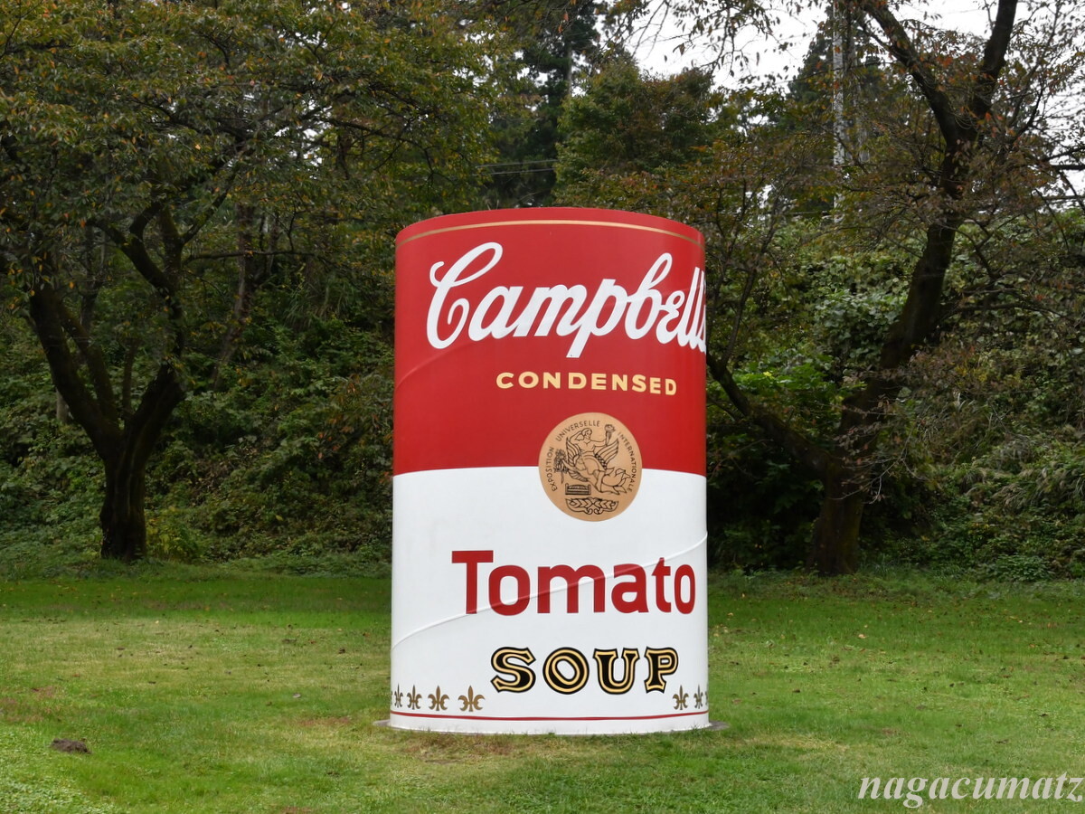 高さ約3メートル、直径約2メートルの鋼鉄製で、キャンベル社のトマトスープ缶と当時同じ図柄が描かれている。デンバーの鉄工所でスチール製の大型缶を3つ製造し、コロラド州立大学の芸術学部の学生達がそこに図柄を描き、現地を訪れたウォーホルがサインを入れて完成したもので、1981年にコロラド州立大学で「アンディー・ウォーホル展」が開催された時に学生達と共同で制作されたもの。世界中に3点しか存在しない晩年の作品。
