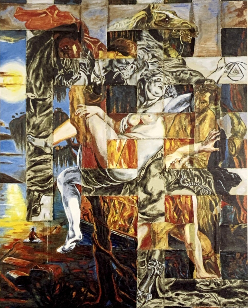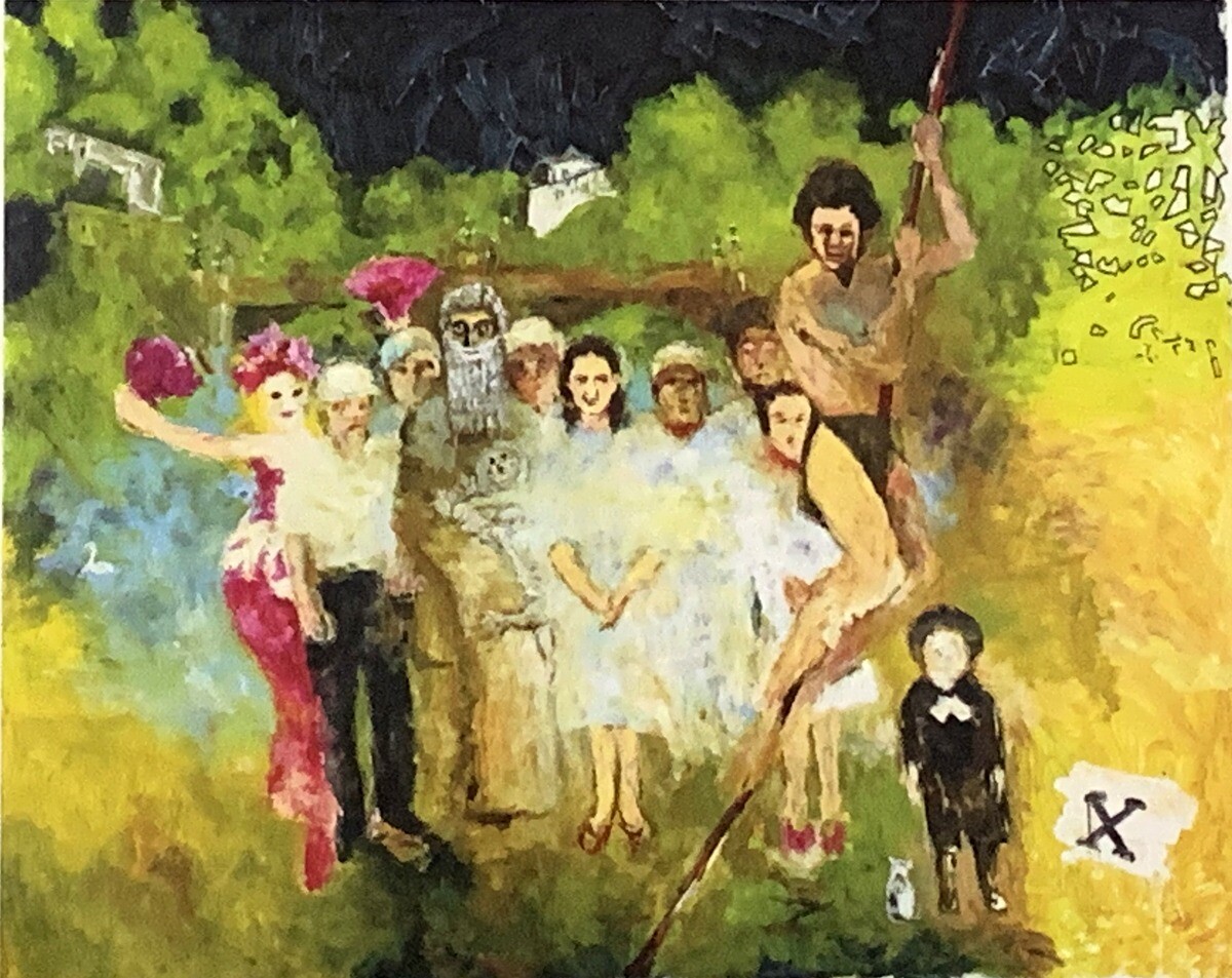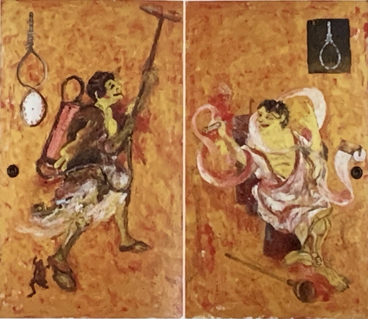 「寒山拾得」2019 の連作 人物の輪郭がはっきりしないが、意図的に行われており、色彩は自由に使われている。子供は遊ぶために生まれて来たのだから、アーティストもそのような気分が必要と。それでも、絞首刑の縄のようなものが描かれている。。。