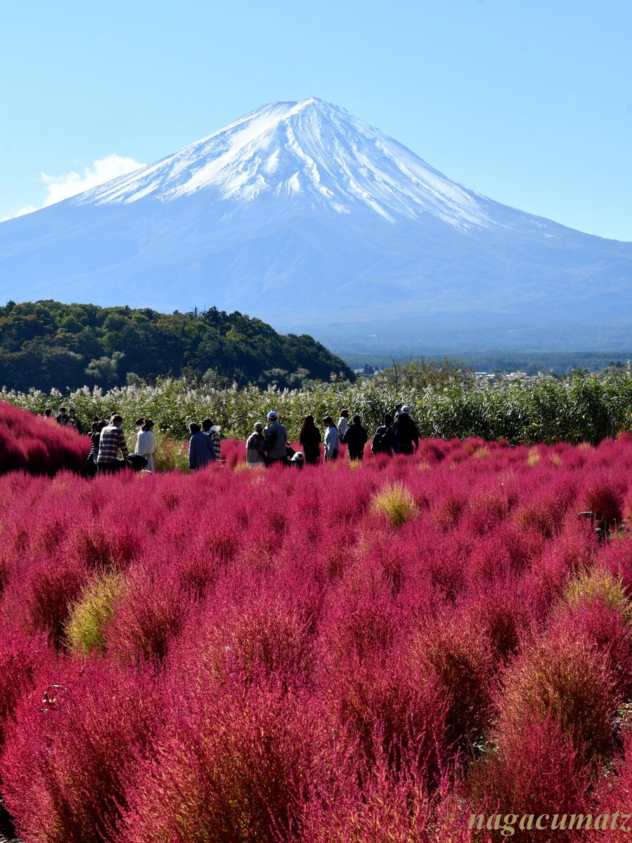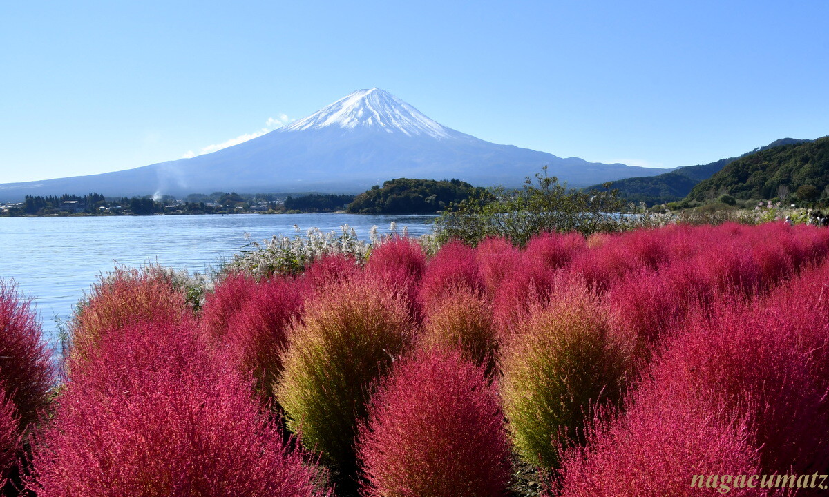 チェックアウトをして、湖畔の大石公園へ。紅葉したコキア(ホウキギ)が綺麗だった。
