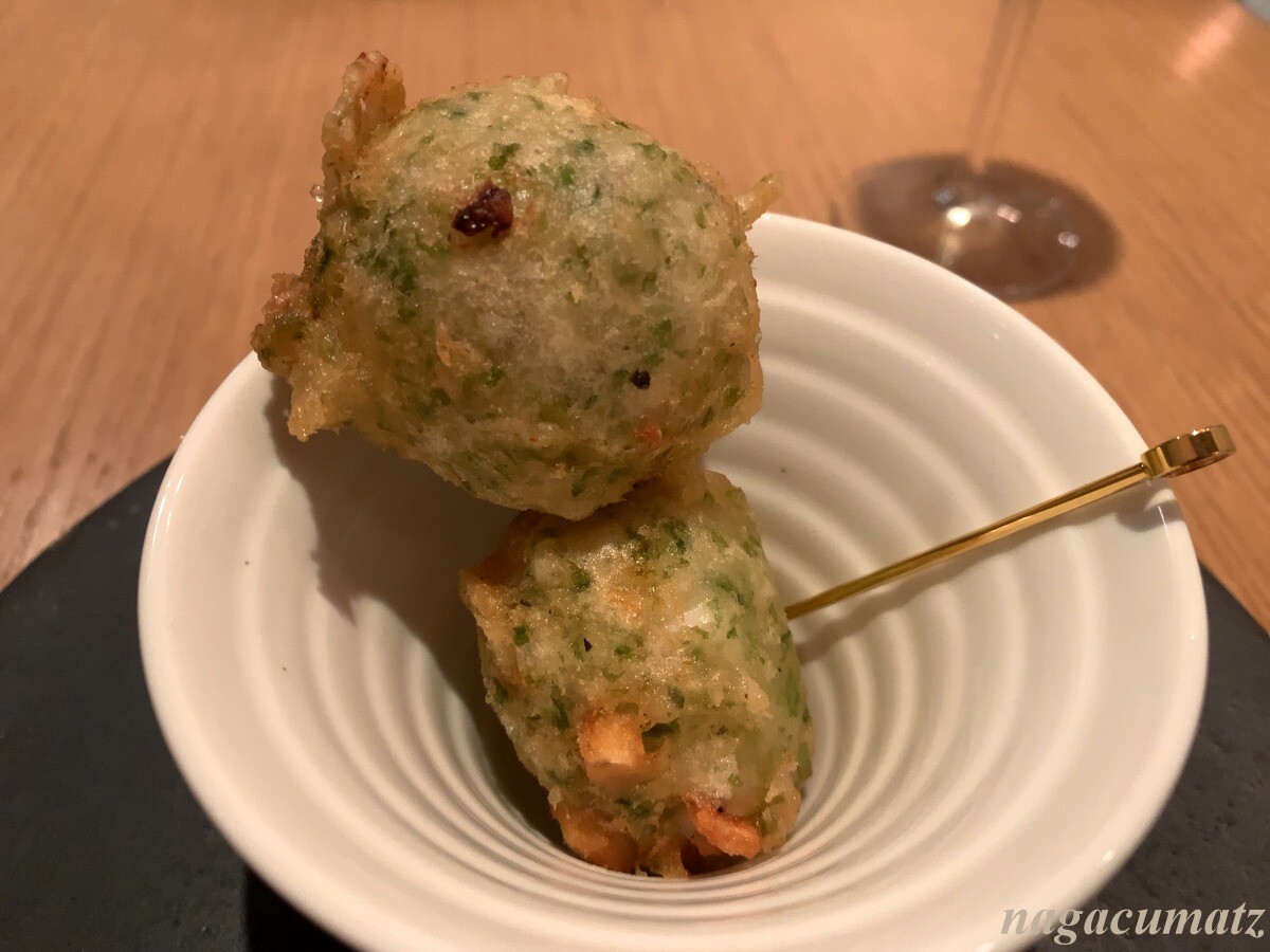 アミューズ・ブーシュ ナポリの揚げパンであるゼッポリーニ。ピザ生地に青海苔と天草のアオリイカが入っている。