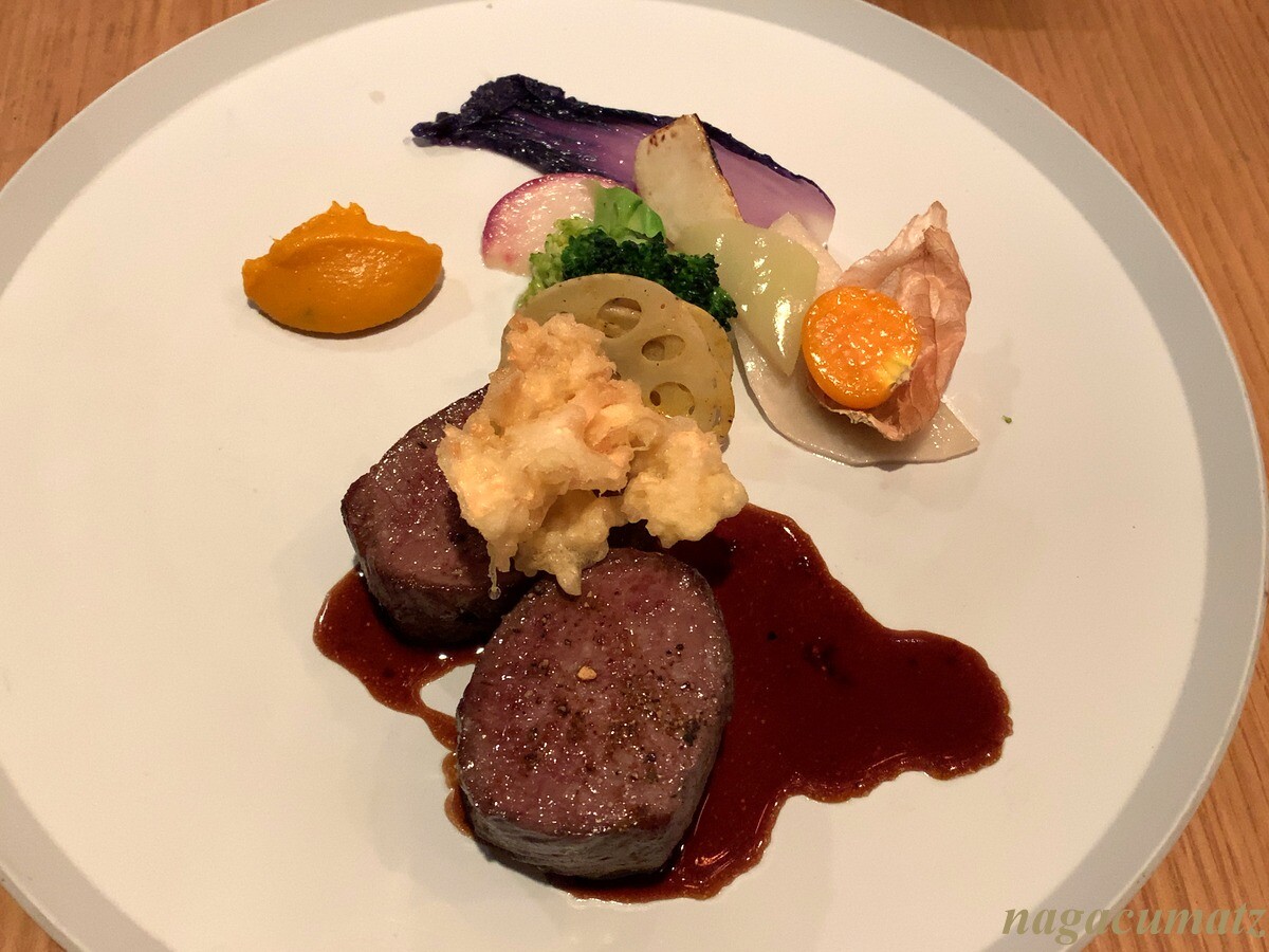 宮崎県産鹿ロースのポアレには、ハナビラタケのフリット、辛子蓮根、ほおずき、人参のピューレなどが付く。鹿の火入れが絶妙な上、とても柔らかくて美味しい。