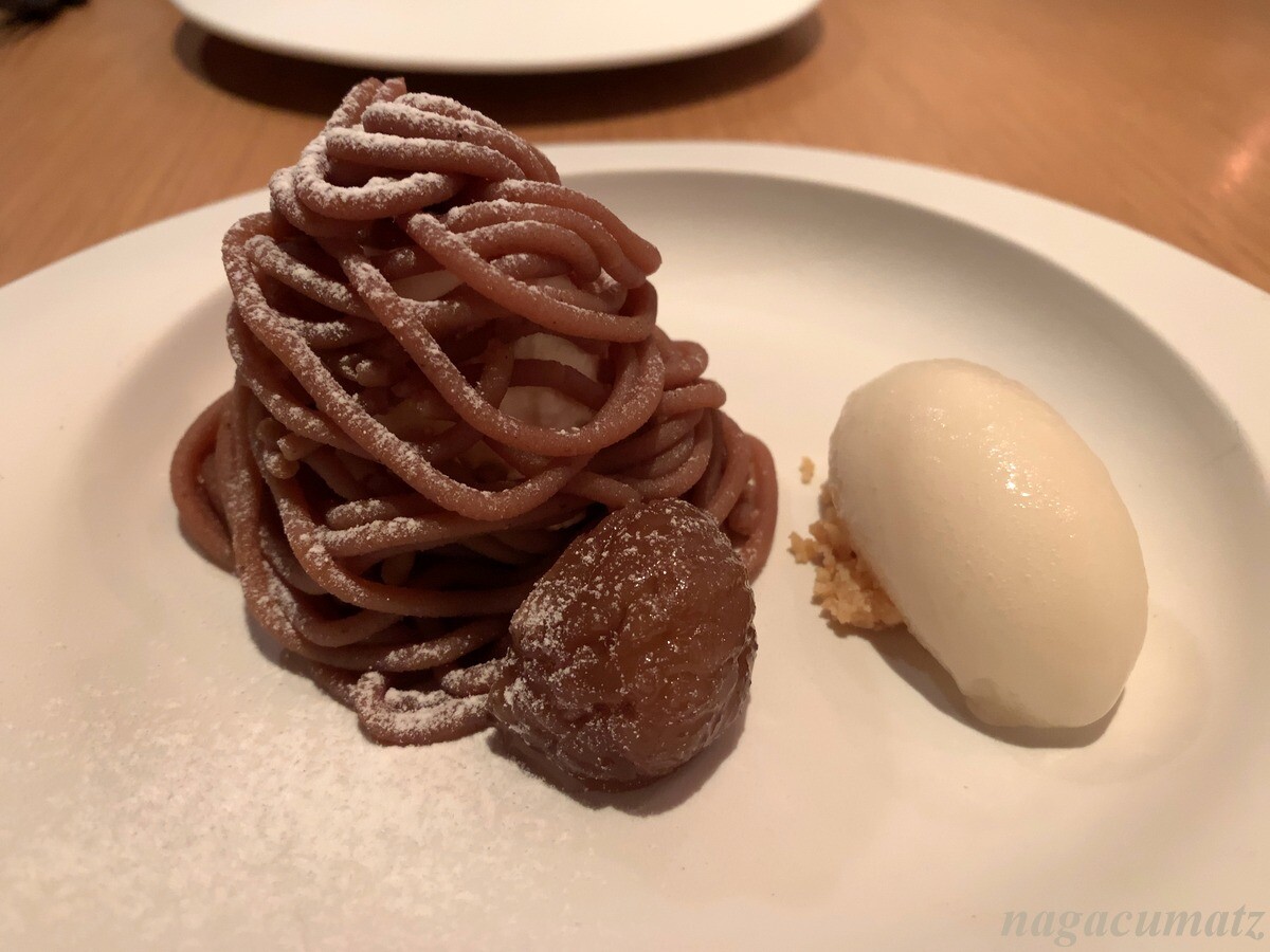 デザートはモンブラン、横にはマロングラッセと洋梨のシャーベットが付く。