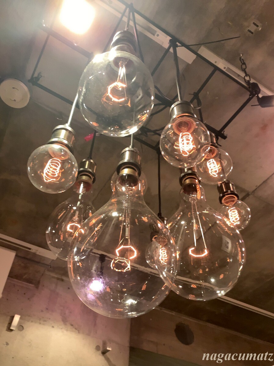 インテリアもシンプルながら、面白いフィラメントのライトがかかるなど。