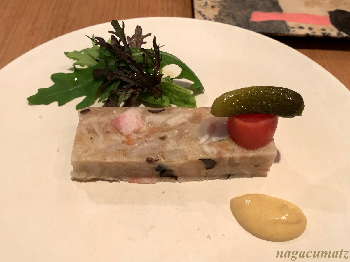 海老・豚足・ベーコンのコラーゲン寄せ 手前にはディジョンマスタードが付く。