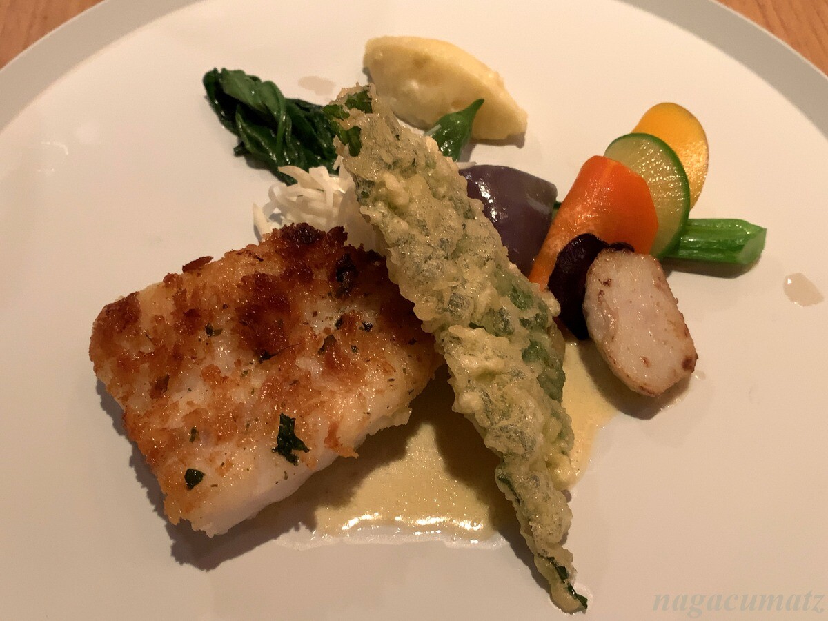 魚料理として天草のヒラメのパン粉焼き。上には黒キャベツのフリット、根セロリ、メイクイーンの粒を残したマッシュポテトなどが付く。ヒラメがとても肉厚でふんわりしていて非常に美味。