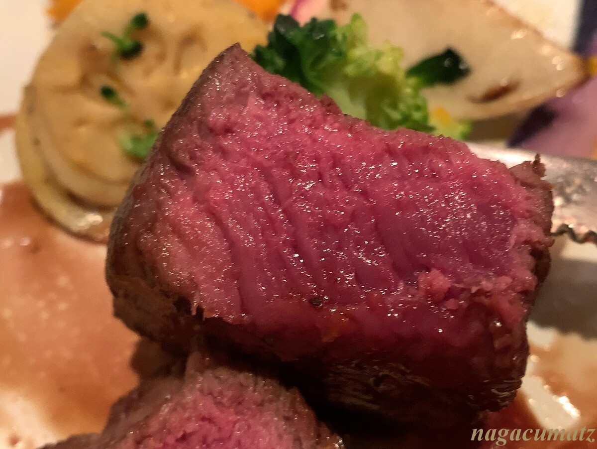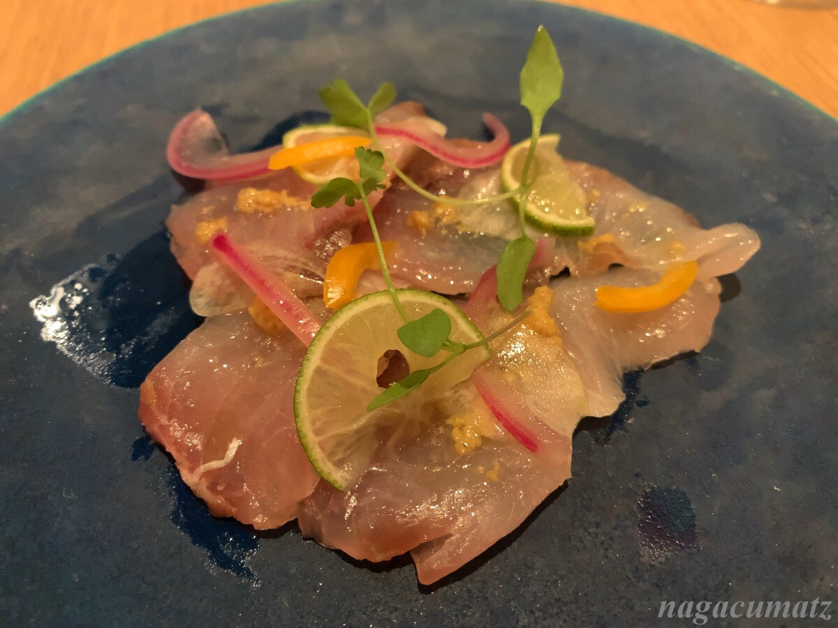 前菜の一つ目は、天草産のヒラメのカルパッチョだったのだが、メインのお魚としてヒラメを選択したので、ロウニンアジ(GT)のカルパッチョにアレンジして下さった。ロウニンアジと言えば、釣って港にあがったばかりの物をパプアニューギニアで見て以来(その様子は こちら)