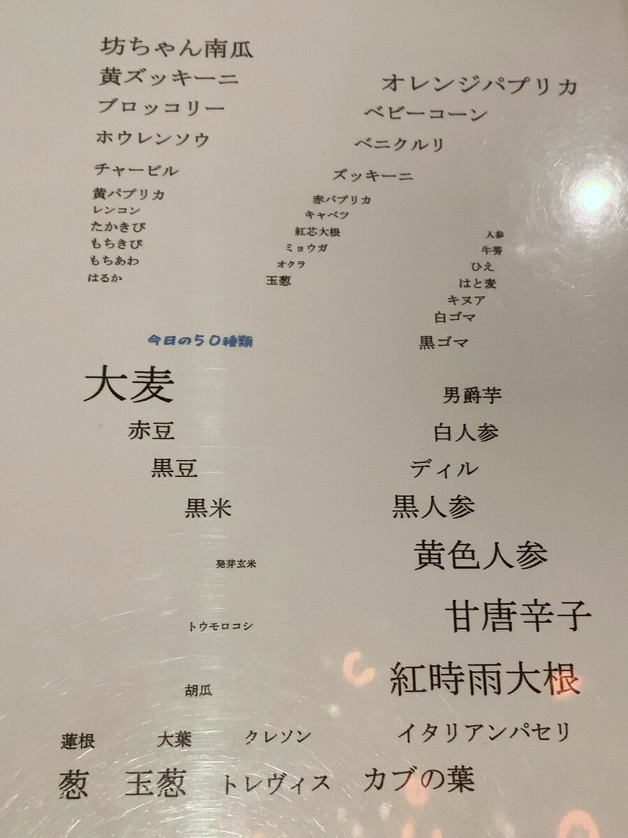 50種類の彩り野菜と穀物のテリーヌには、34種類のお野菜と16種類の穀物がギッシリ。その内容を示すボードも見せてもらえる。テリーヌの周りは人参。横にあるのは巨峰のソース。色々なお味をいただけて、楽しめた。