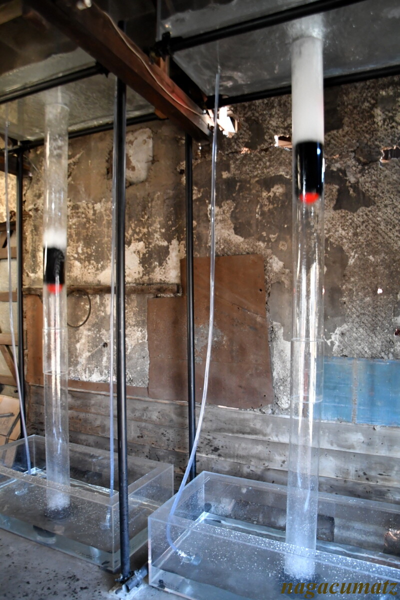 パイプ、水、空気のピストン運動が、円柱の中で行われるオブジェ。鼓動する心臓や機関車を連想させる。次ぎの作品と呼応している。