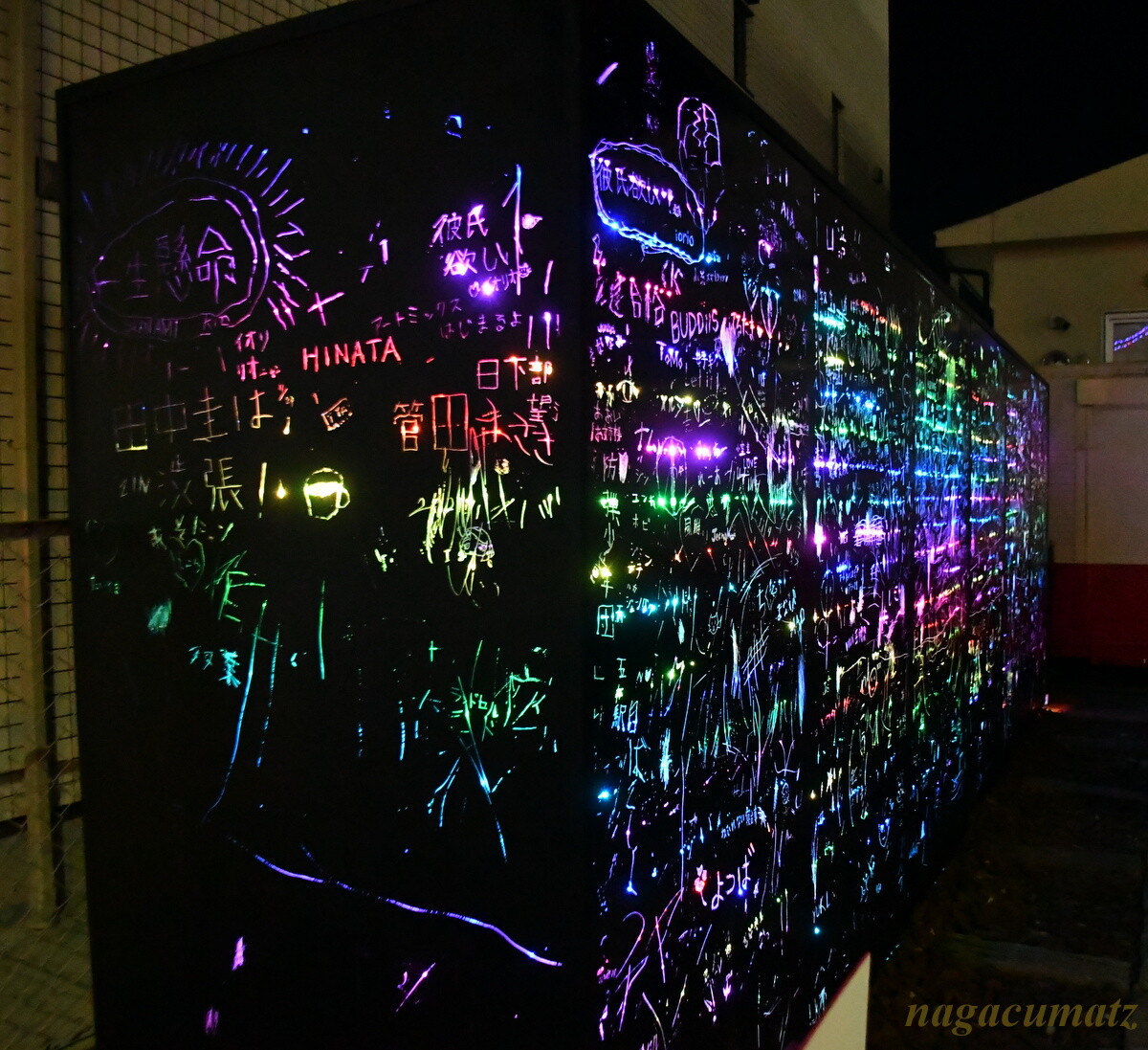 来訪者が思い思いに文字や絵を特殊なペンで、ガラスキューブを覆う黒い塗料を削るように描いていく。夜になって中のライトが点灯すると綺麗な文字が見えて来る。