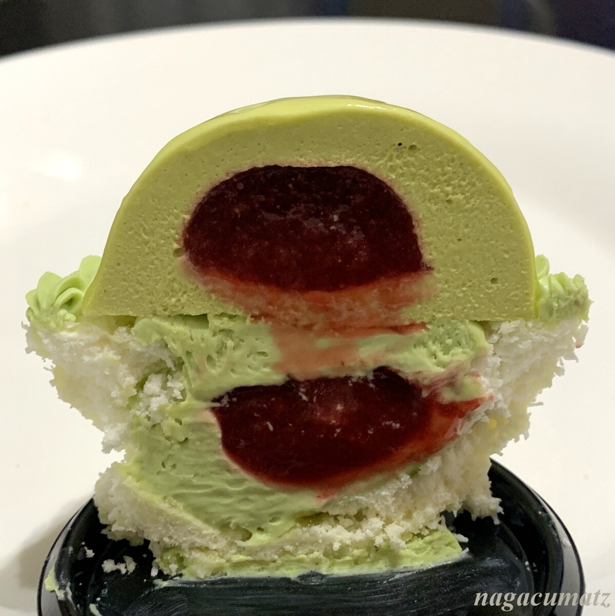 ピスタチオクリームの2種類のムースのそれぞれの中には、イチゴのソースが入っていて、切るとすぐに出てくる。下にはココナッツがまぶしてあり、アクセントになる。美味しい。