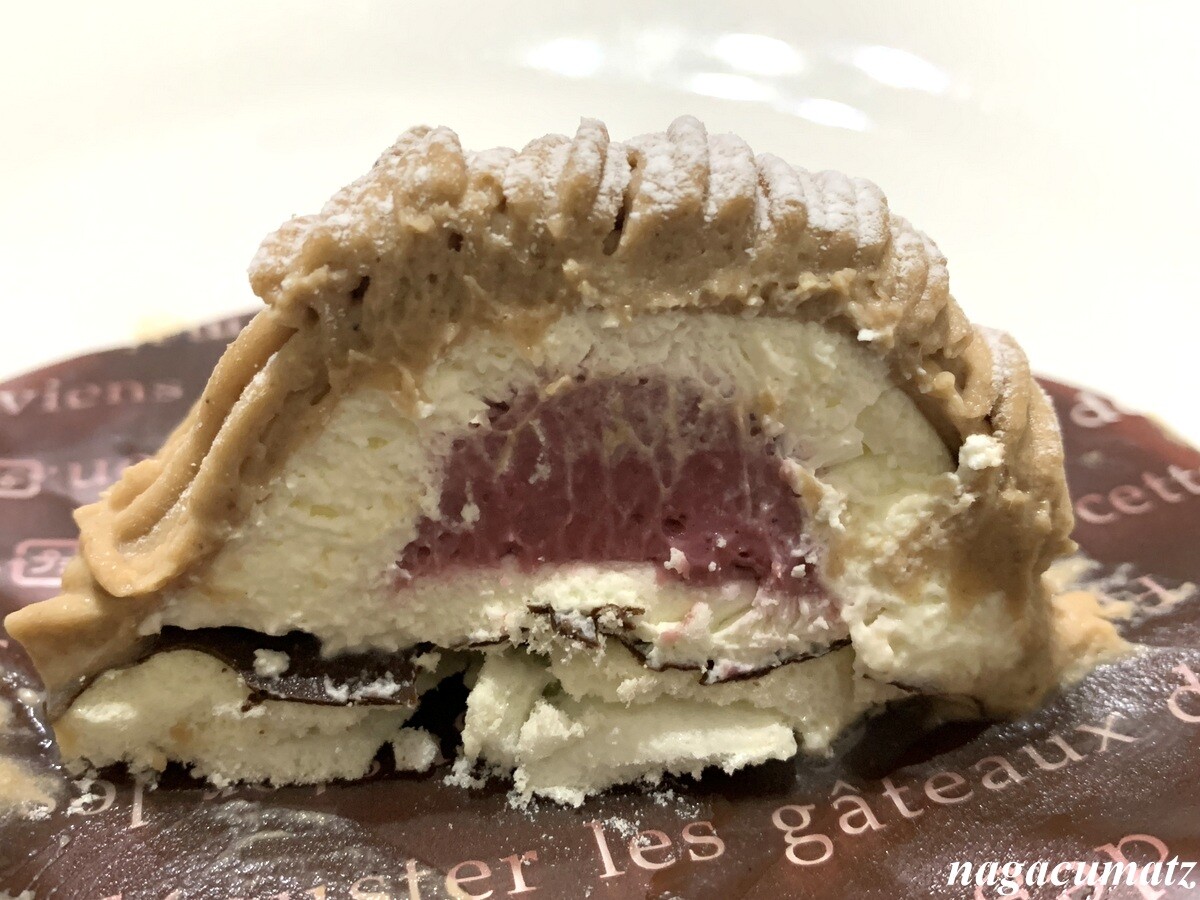 カシスクリームが入っているモンブランはあっさり系かな。メレンゲ台をチョコレートでコーティングしているのが良い感じ。