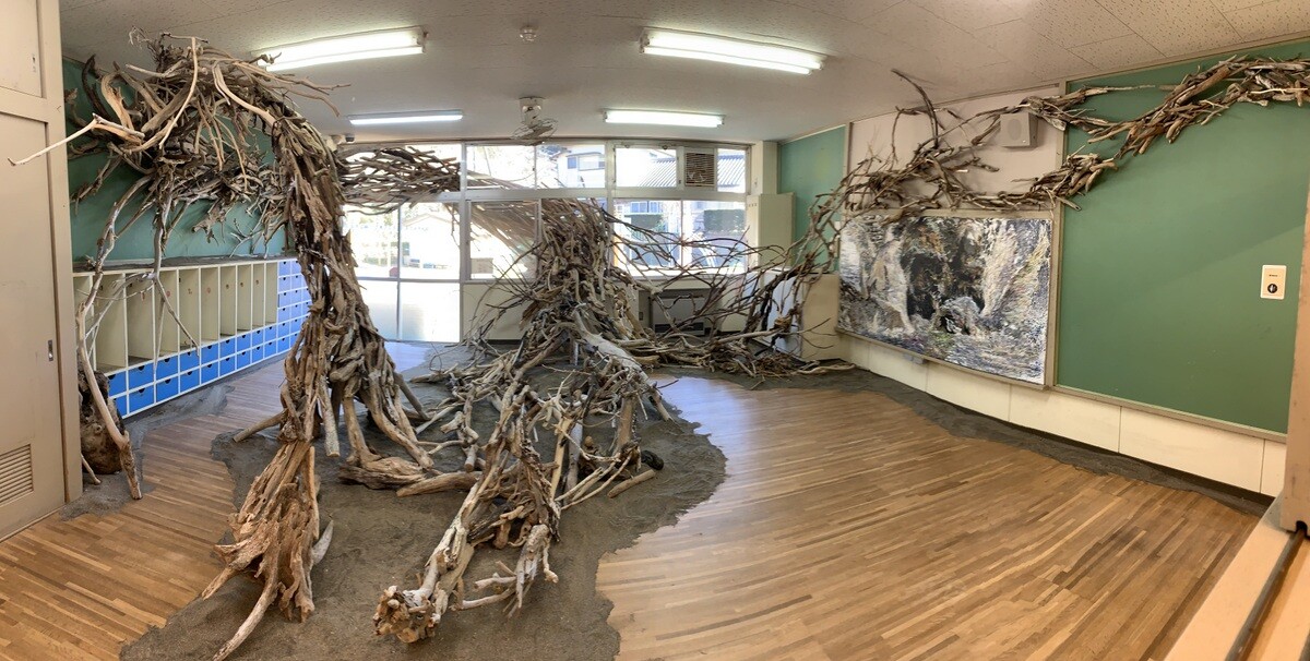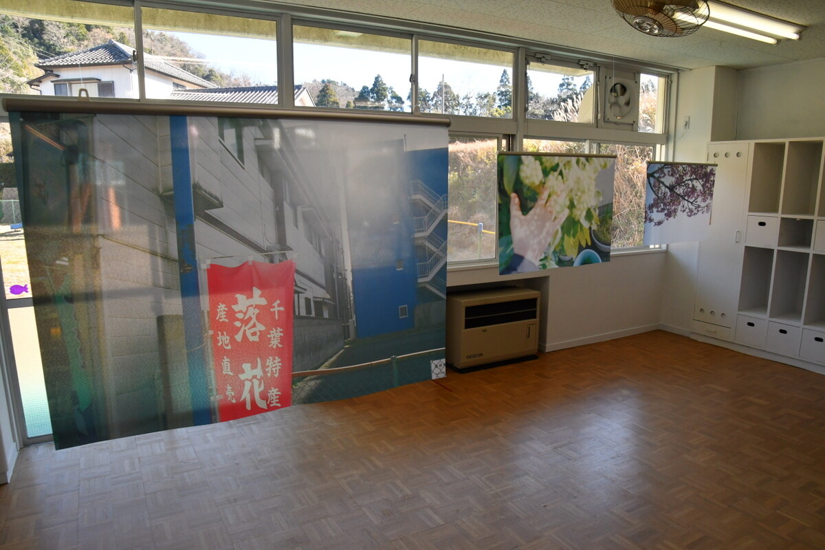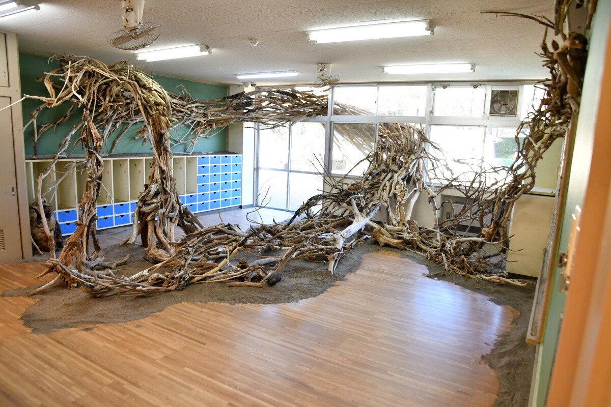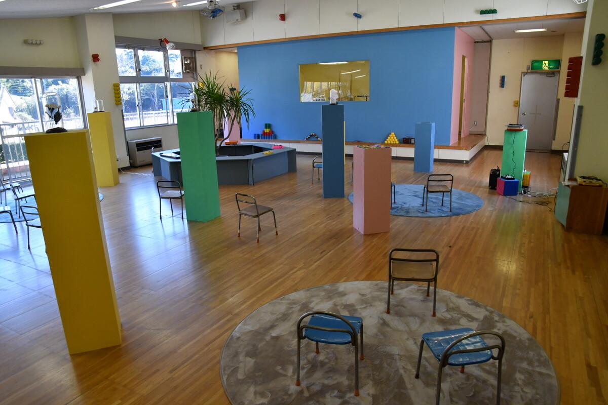 旧保育所の事務室に残された内装や備品や玩具などを使ったインスタレーション。完成した作品だけでなく、試作や作業道具などのあるアトリエ空間とのこと。