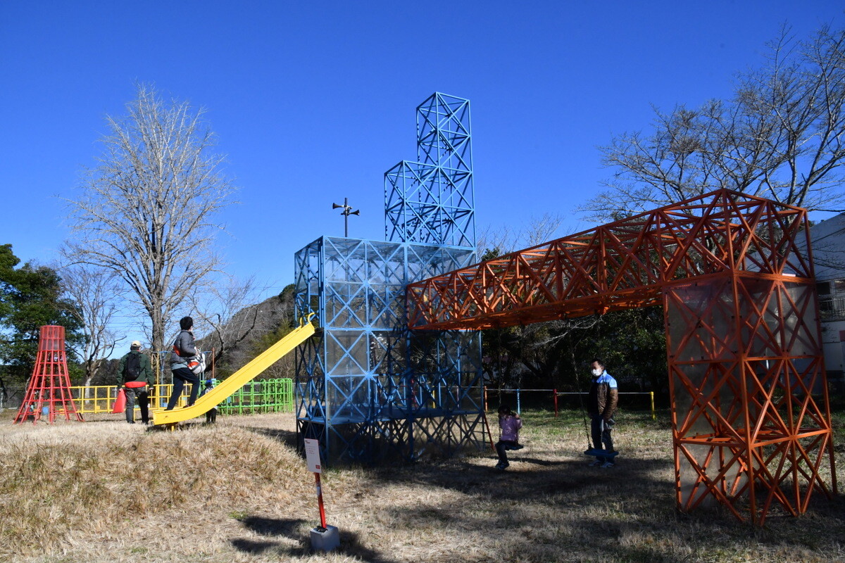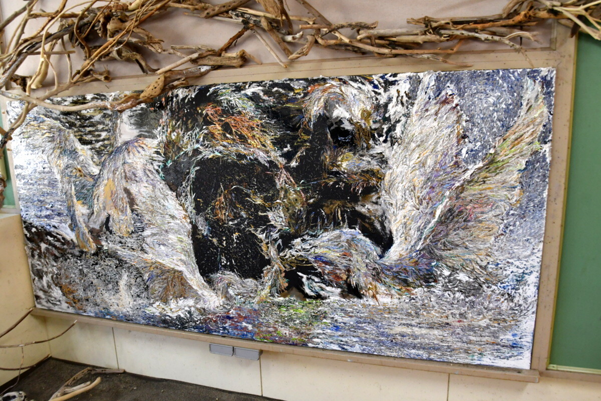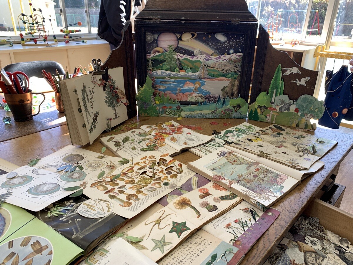 旧保育所の事務室に残された内装や備品や玩具などを使ったインスタレーション。完成した作品だけでなく、試作や作業道具などのあるアトリエ空間とのこと。