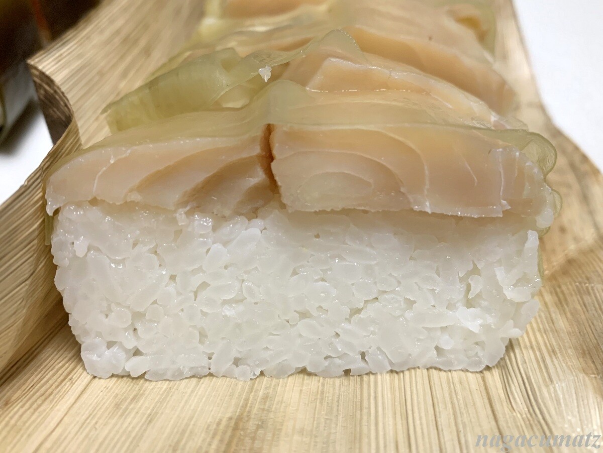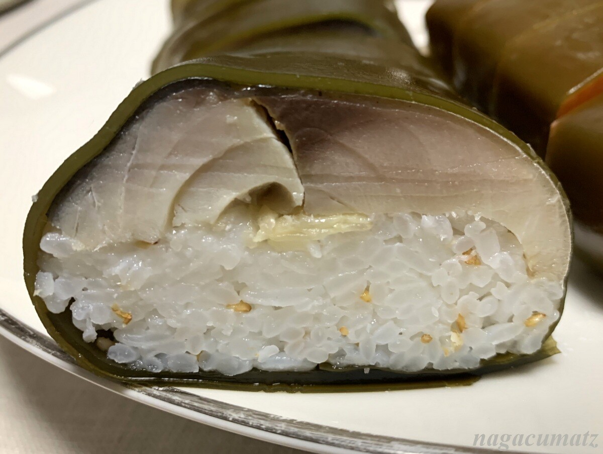 吾左衛門鮨 極上鯖 1本2900円 御飯には生姜と金ごまが入っている。肉厚。