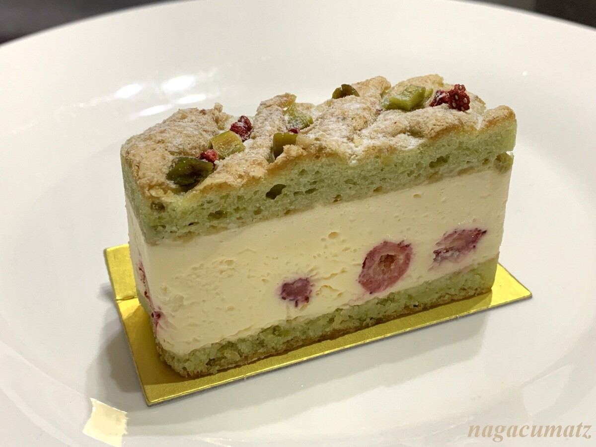 ピスタチオのダックワーズ生地にフランボワーズの入った白ワインムース。白ワインムースからは葡萄の香りがプンプンするぐらいで美味。