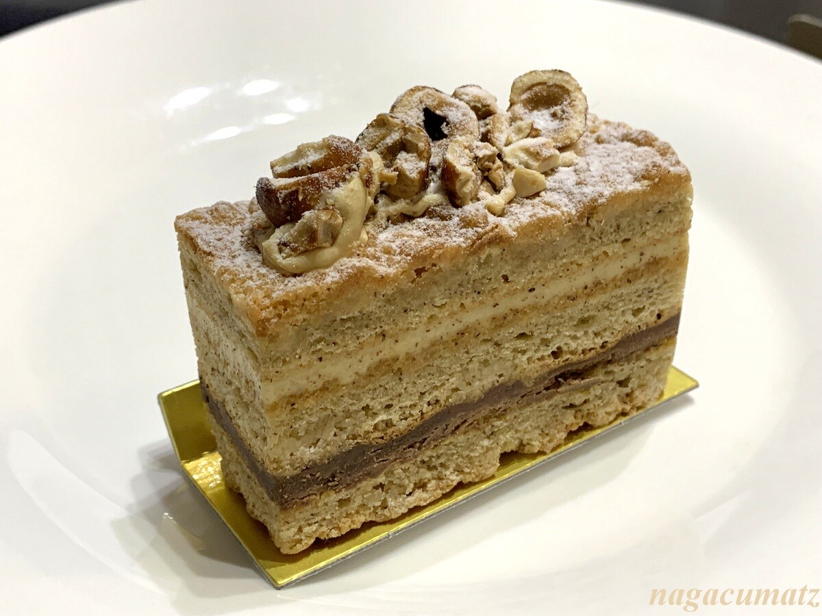 ヘーゼルナッツペーストを使ったジョコンド生地に、ジャンドゥージャのガナッシュとヘーゼルナッツのバタークリームをサンドしてある。