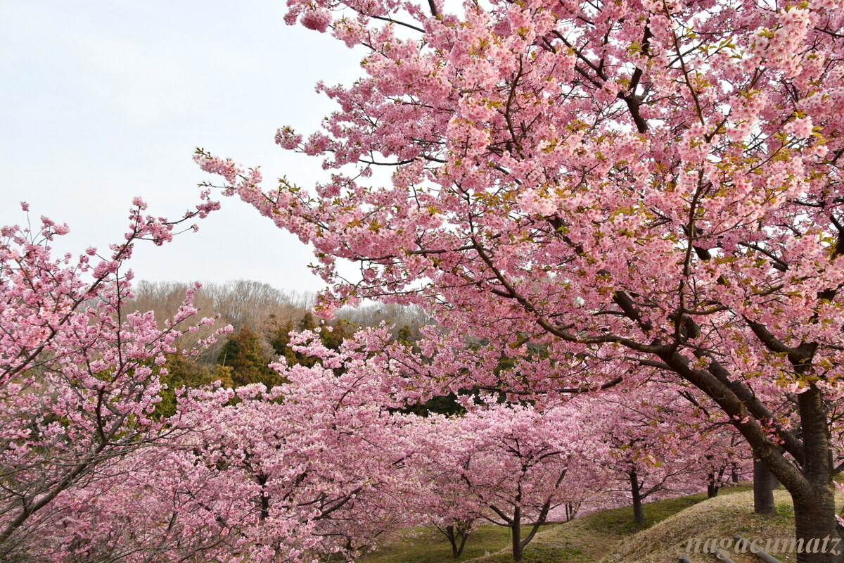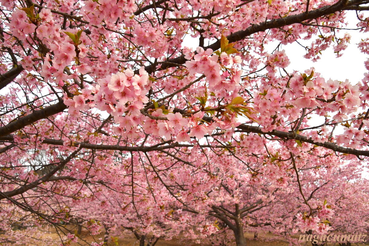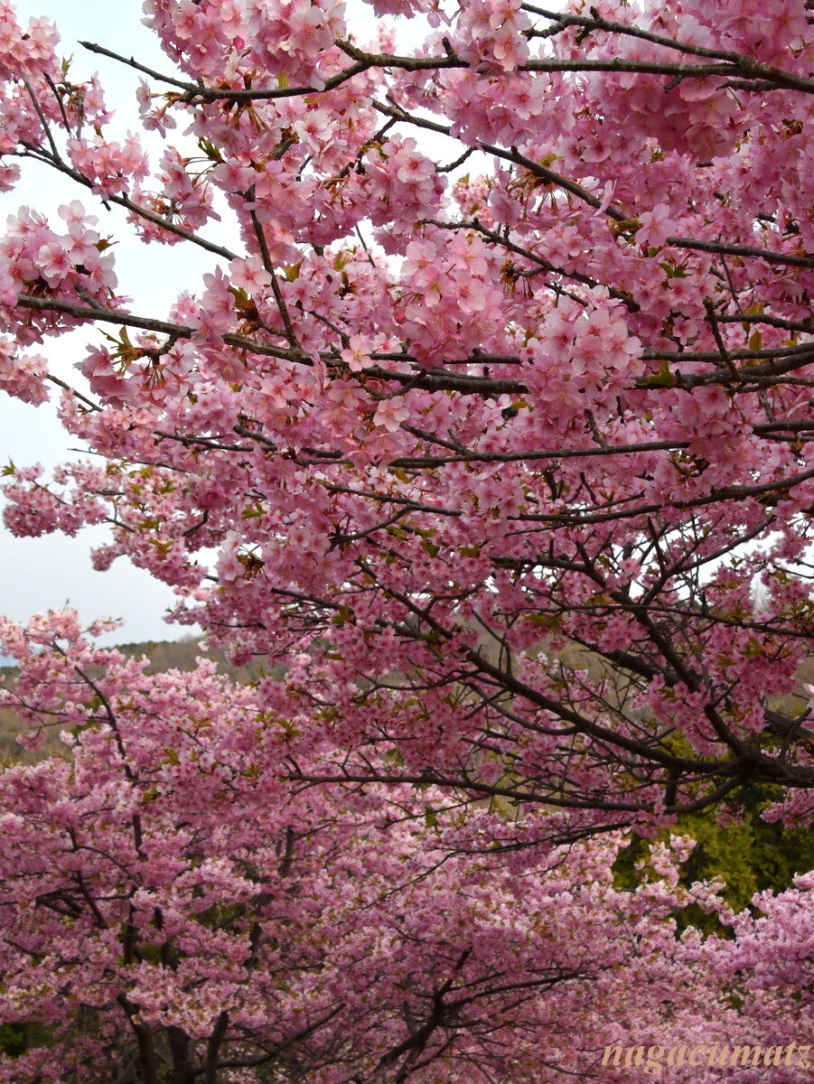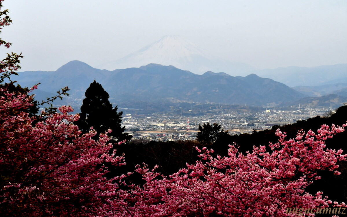 ここは富士山と河津桜とのコラボが有名な場所なのだが、あいにく薄曇りとなってしまって、肉眼では富士山は見えるものの、写真には上手く撮れず。。。富士山を何とか確認できるぐらいまで暗くすると桜が紅色になってしまった💦