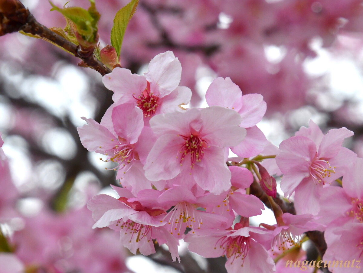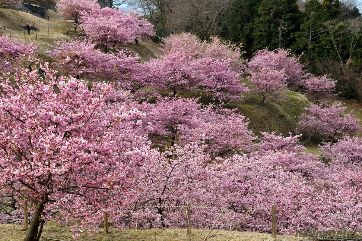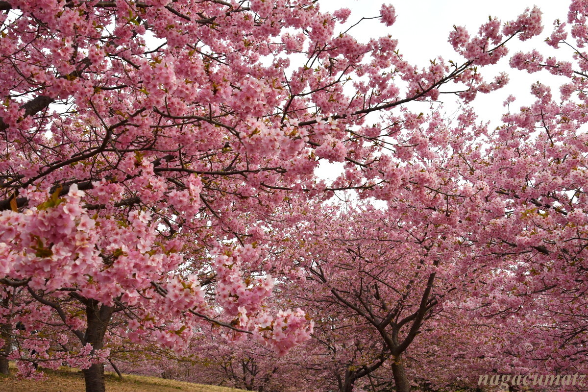 ここは富士山と河津桜とのコラボが有名な場所なのだが、あいにく薄曇りとなってしまって、肉眼では富士山は見えるものの、写真には上手く撮れず。。。富士山を何とか確認できるぐらいまで暗くすると桜が紅色になってしまった💦