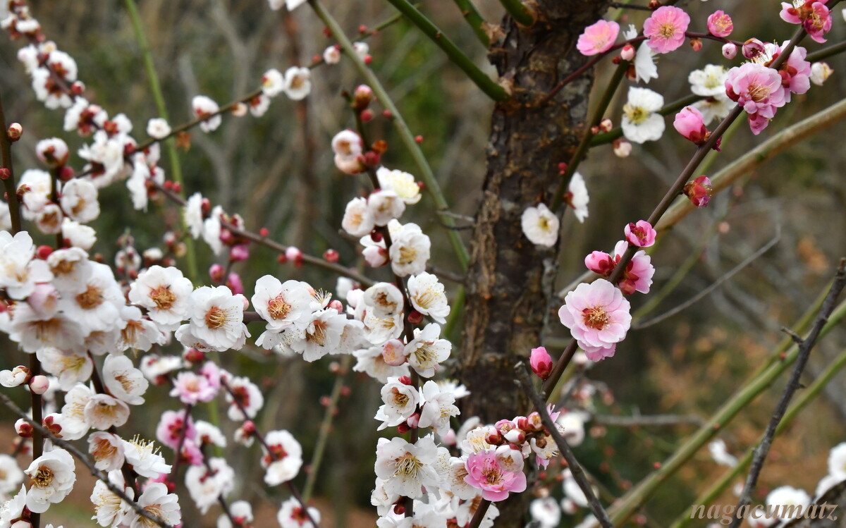 白と紅が一本に咲く源平咲きの梅も
