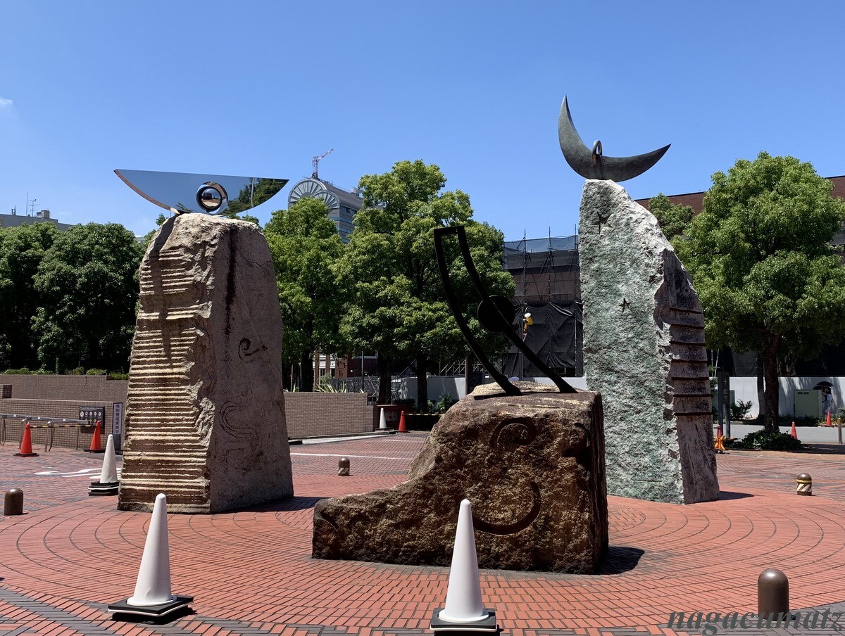 この場所は三澤氏が幼少の頃の遊び場で、向かいにある加計塚小学校の卒業生とのこと。作品を制作するにあたり、設計事務所と施工会社 2社の合わせた 3社が恵比寿ガーデンプレイスに花を添えたいという主旨のモニュメント化と言うことで、3点による集合のモニュメントとなったとのこと。
