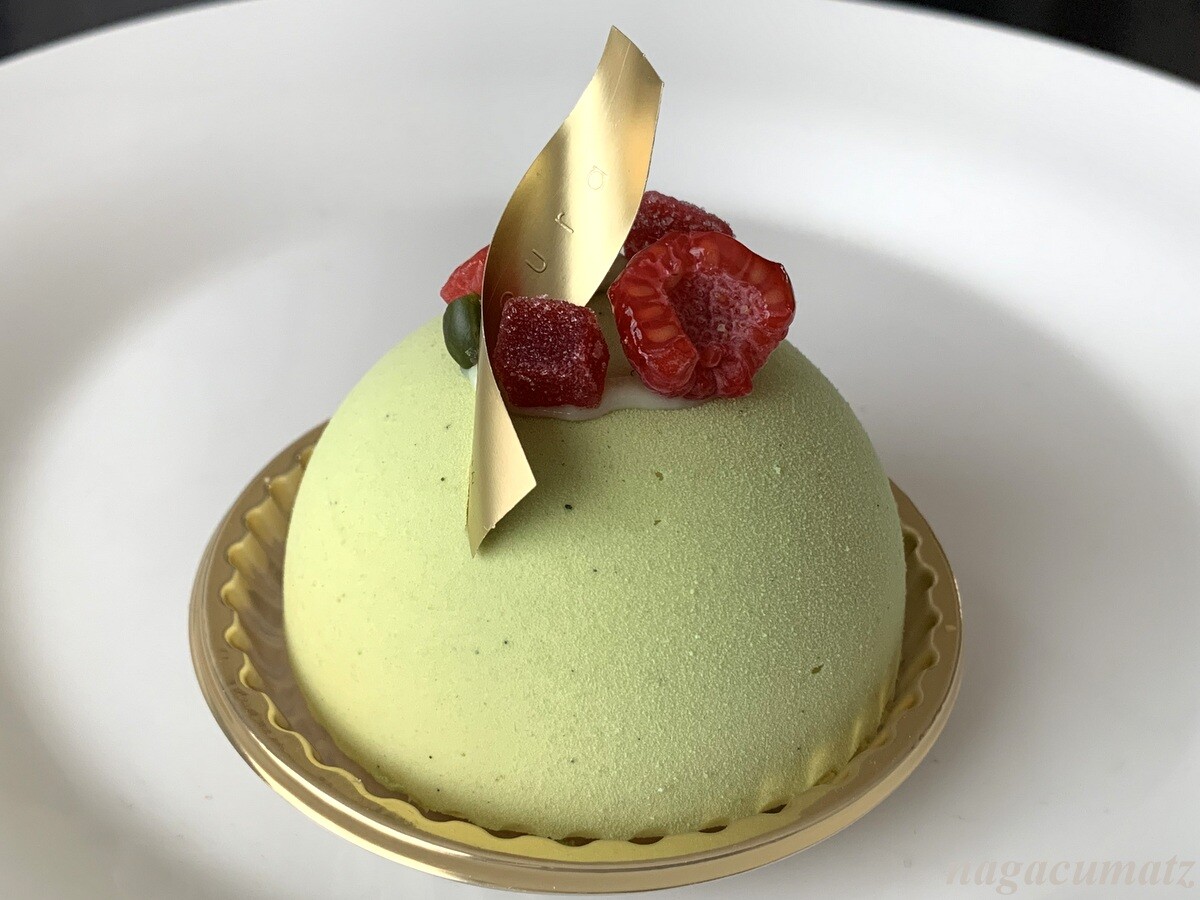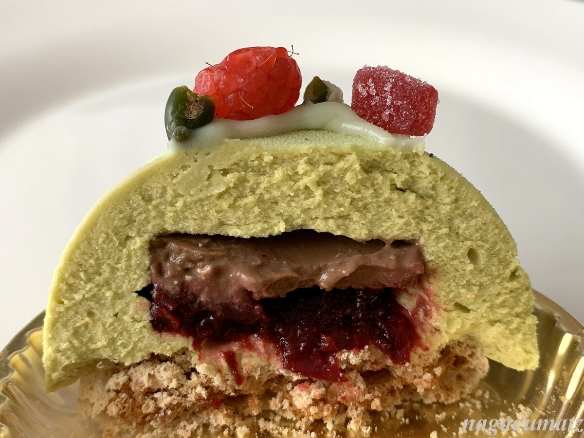 スワイユ 600円 ピスタチオのバタークリーム、チェリーのジュレ、ショコラのムース、アーモンドのメレンゲ。