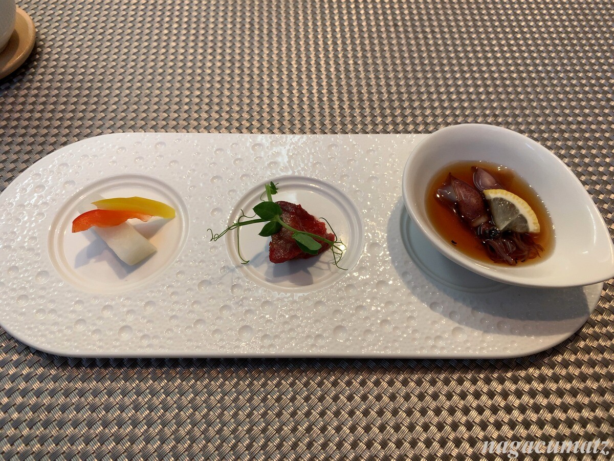 前菜3種は、大根とパプリカの酢漬け、毛氏紅焼肉と豆苗、ホタルイカ。湖南料理の毛氏紅焼肉も美味しかったが、ホタルイカがたっぷりのお酒のたれに浸けられていて美味しい。