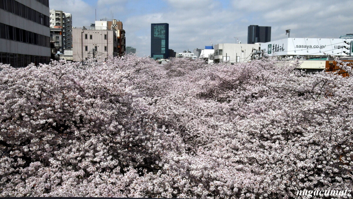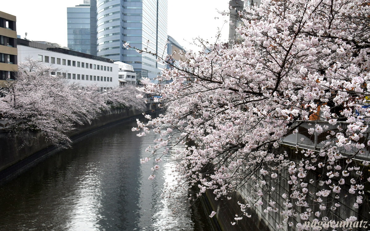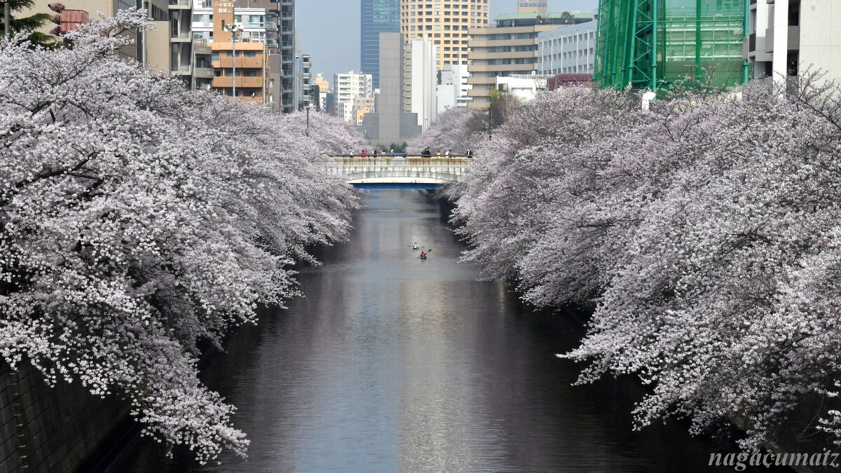 中目黒より上流は川幅が狭くなるので、両側からの桜がトンネルを作っている。