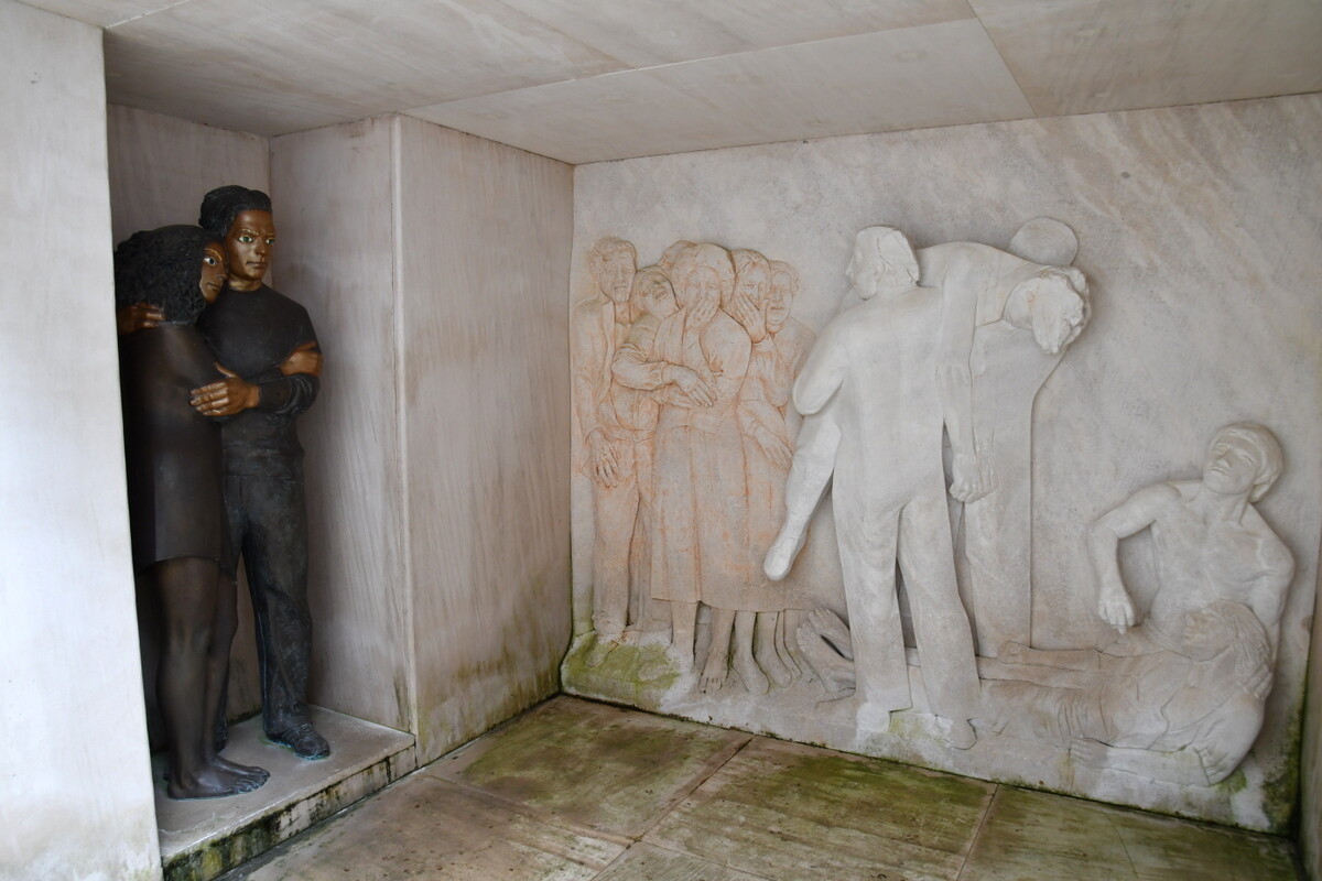 「天の階段」1994 鑑賞者が作品の中に入り(階段を降りて)体験する作品。暴力によって虐げられた人々の苦悩の表情の彫刻があり、その横には男女の姿。暴力から抜け出した先にある希望を表現したのだそう。