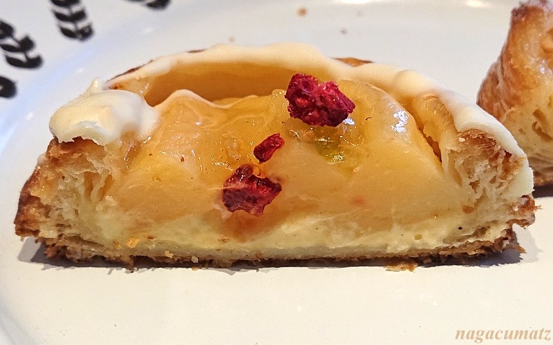 フルーツが色々と乗ったものを。オレンジ、イチジク、アプリコット、大きめが桃。いずれもパイ生地がサクサクで美味なのだが、この桃の生地が秀逸。薄い生地の台にカスタードクリームと桃が乗っていて美味しい。