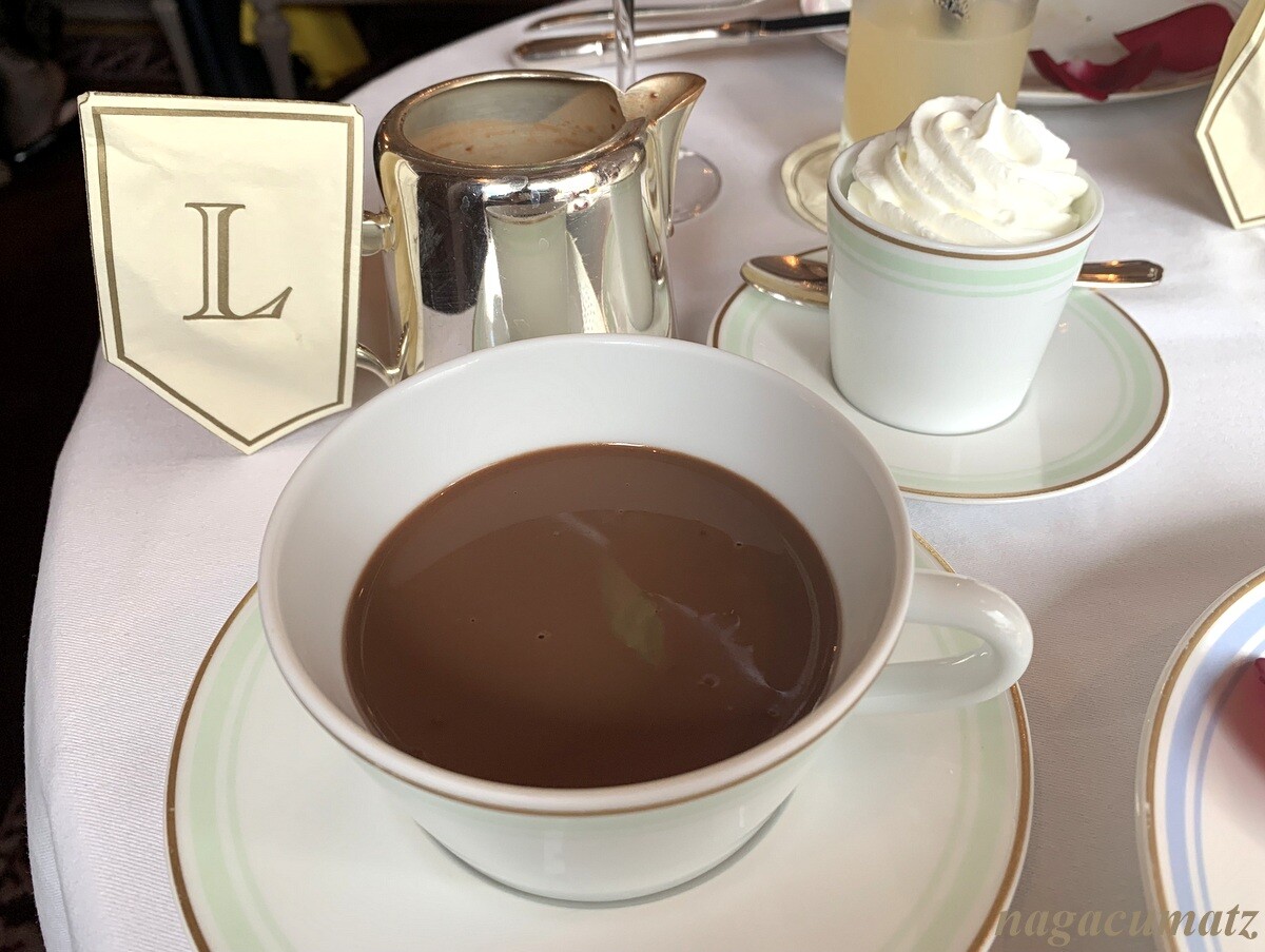 ホットドリンクは紅茶やコーヒーなどから、1種類しか選べずワンポットサービスとなっているだけ。だったらと、ホットチョコレートのクリーム付きを。