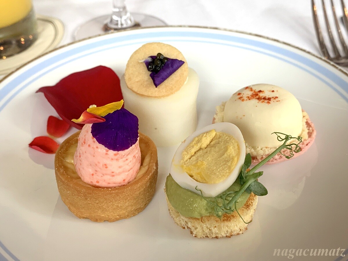 セイボリーは4種類。カナッペにはアボカドとうずらの卵に豆苗、キッシュにはタラモサラタ、茹でたジャガイモをくりぬいたもの、白いドームは塩味のきいたチーズ系(だったかな)。