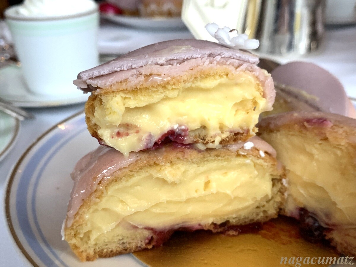 ルリジューズ・マダム・ド・ポンパドゥールなるケーキは、シュー生地にカスタードクリームが入っていて結構大きい。ただ、上下ともに同じお味な上、グレイズドもぶ厚めで飽きてくるかも。