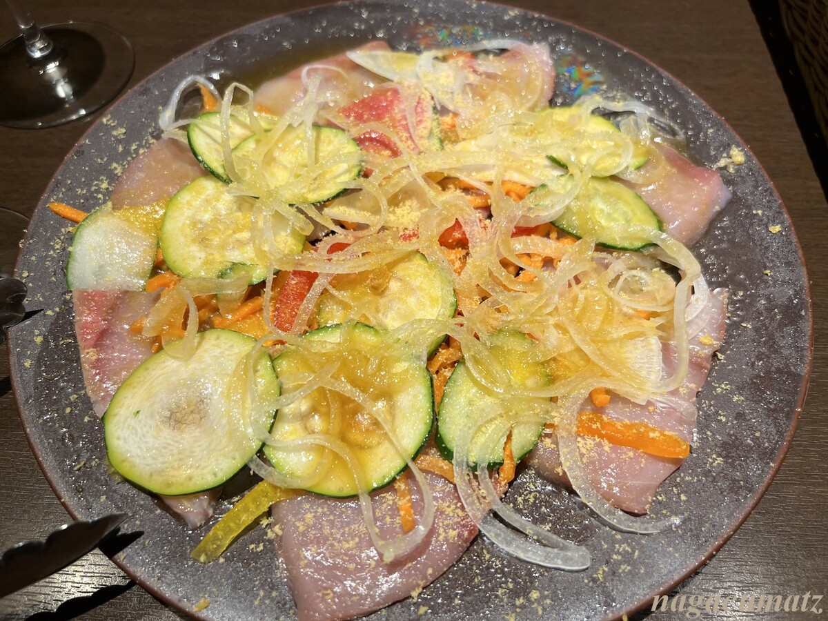 本日の日替わり冷前菜として、ブリのカルパッチョ 自家製カラスミがけ 1320円