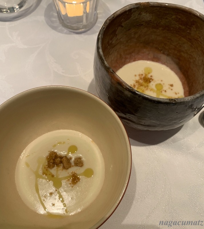 雲丹の粉末やニンニク風味のパン粉、イカスミのソースなどが添えられている。イカが香ばしくさっとあぶってある。雲丹は函館産。美味しいのだが、結構柑橘系の風味もあり、フェンネルやタラゴンなどの生ハーブもあるので、お味が色々と散ってしまった感もあるような。。。