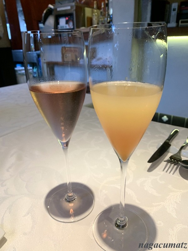 キールインペリアル(スパークリングワインとフランボワーズリキュール)1000円、ホワイトミモザ(スパークリングワインとグレープフルーツジュース)1000円