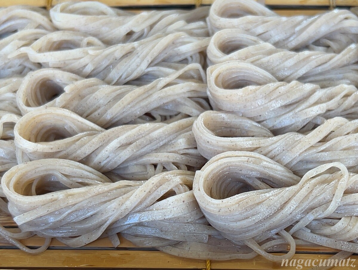 因みに、「へぎ」は、お蕎麦を盛り付ける容器のこと。木枠にスノコを渡したもので木の皮を削いで作った容器で、「削ぐ」が「へぐ」に訛り、「へぎ」となった。大きなへぎから複数人でお蕎麦を食べることから、撮りやすいサイズに束ねて盛り付けるが、その束ねた形が着物を織る際の糸束を模しているとも言われている。