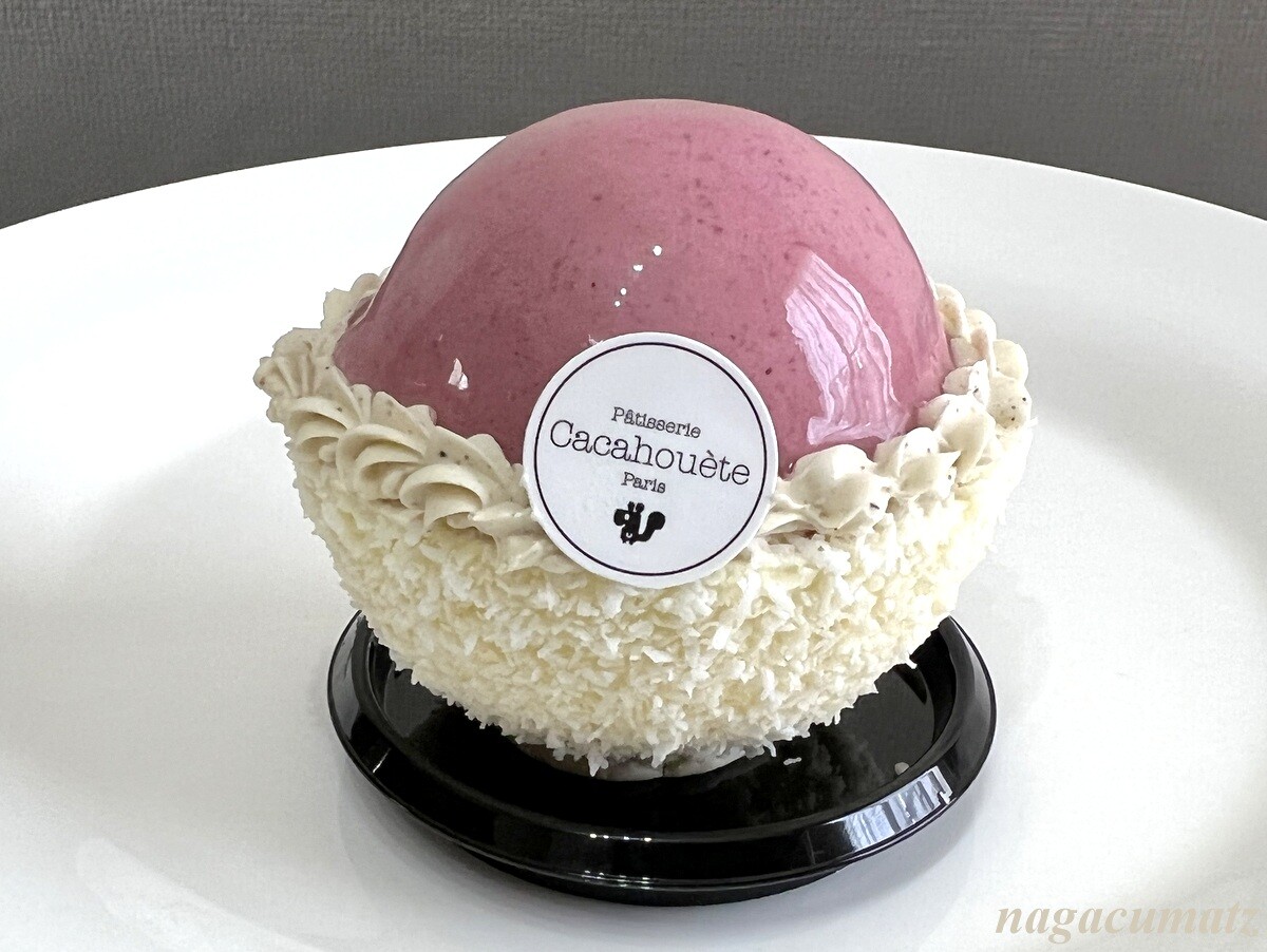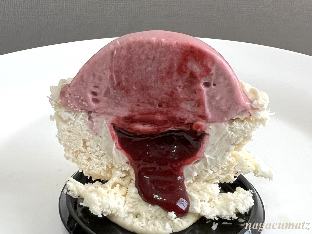 パブロバ カシス 650円 新作。メレンゲの土台の中には濃厚なバニラクリーム、その中にカシスソースが入っているが、カットしたとたんに流れ出て来た。上にはカシスムースなのだが、2層になっている。非常に美味。