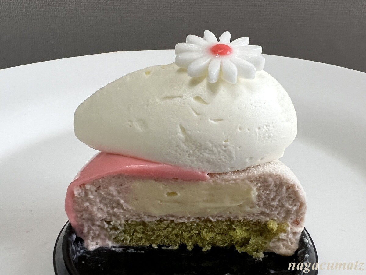 ピンクレディー 650円 ピスタチオのスポンジの上にイチゴのムース、上にはあっさりしたクレームシャンティ。イチゴの香りがしっかりしていて美味しい。